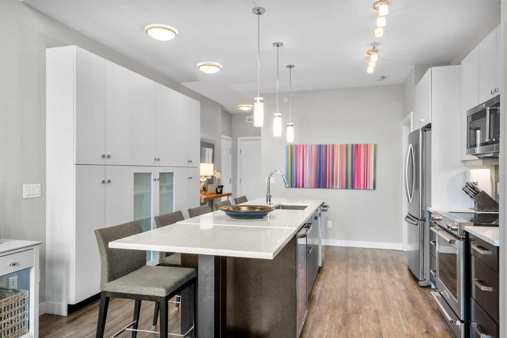 OPEN HOUSE SATURDAY MARCH 28 1-3 AND SUNDAY MARCH 29 1-3PM. Welcome to one of the most desirable residences in the building, an exceptional two-bedroom PENTHOUSE SW corner unit in Lower Mount Royal just steps from vibrant 17th Avenue. Privately positioned on the top floor, this home enjoys premium west exposure with dramatic 15+ ft vaulted ceilings and floor-to-ceiling windows that fill the space with natural light. Extensively upgraded and impeccably maintained, this home showcases wide plank flooring, designer lighting, and a bright open concept layout ideal for both everyday living and entertaining. The kitchen is beautifully appointed with a statement island, stainless steel appliances, soft-close cabinetry, under-cabinet lighting, a wine fridge, and an upgraded oversized Blanco sink, a seamless blend of function and style. The inviting living area flows effortlessly to a private west-facing deck with gas hookup, perfect for morning coffee, evening sunsets, and summer BBQs. The primary suite offers a refined retreat with double closets and a spa-inspired ensuite with dual sinks. The second bedroom is well sized and complemented by a full second bathroom, making it ideal for guests or a home office. Over $12,000 in upgrades elevate the home, including air conditioning, designer ceiling fans, dimmer switches, phantom screen, upgraded blinds, and additional thoughtful improvements throughout. Additional features include in-suite laundry and heated titled underground parking. This is a compelling opportunity for both homeowners and investors. Penthouse corner units with this layout, exposure, and level of privacy rarely come to market. Immaculate condition, premium upgrades, and an unbeatable inner-city location make this a standout offering. Lower Mount Royal offers an exceptional lifestyle that goes well beyond location. Residents enjoy access to the Mount Royal Community Association, known for its vibrant and engaged community atmosphere. Seasonal events such as the Mount Royal Stampede breakfast, progressive dinners, and wine and cheese nights create a true neighbourhood feel rarely found in inner city living. The community also features tennis courts, parks, pathways, and green spaces, along with easy access to boutique shopping, dining, and entertainment along 17th Avenue. This is a rare opportunity to own a top-floor penthouse in one of Calgary’s most established and sought-after inner city communities.