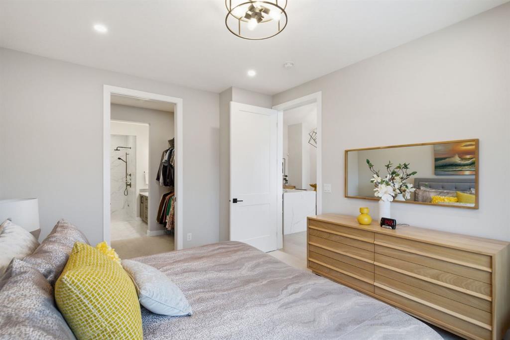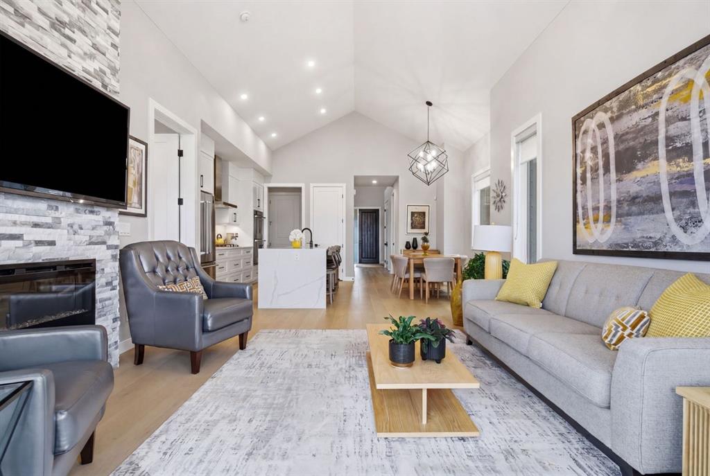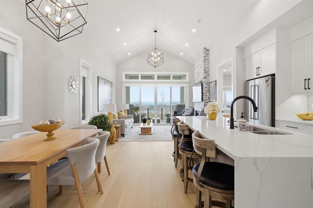 Welcome to this beautifully upgraded bungalow villa in the sought-after community of Crestmont. Offering over 2,100 sq ft of thoughtfully designed living space and a rare combination of luxury, low-maintenance living, and breathtaking views with no neighbours behind. Built in 2021 and offered by the original owners, this home showcases exceptional pride of ownership and a carefully curated list of upgrades throughout. The main level is bright and inviting, highlighted by soaring vaulted ceilings, engineered hardwood flooring, and expansive windows that perfectly frame the peaceful natural setting beyond. The chef-inspired kitchen is both stylish and functional, featuring upgraded appliances including a gas cooktop and double wall ovens, quartz countertops, full-height cabinetry, and a stunning waterfall island that anchors the space. The open-concept layout flows seamlessly into the dining area and spacious living room, where a floor-to-ceiling rock feature wall and electric fireplace create a warm and modern focal point. Step outside to the covered deck and take in the uninterrupted views—this is where the home truly shines. With no neighbours behind, you’ll enjoy a sense of privacy and tranquility that is hard to find. The primary suite offers a private retreat, complete with a walk-in closet featuring custom organizers and a spa-like ensuite with a steam shower and upscale finishes. A convenient main floor laundry room with sink and an additional 2-piece bathroom complete this level. The fully finished basement expands your living space with in-floor heating throughout, a large recreation room with a second electric fireplace, and a beautifully designed wet bar with beverage fridge—perfect for entertaining. Additional space provides flexibility for guests, a home office, or hobby areas. Additional features include an attached single garage, in-floor heating in both the basement and ensuite bathroom, upgraded lighting and finishes throughout, and the added value of being an end unit. With low-maintenance living and every upgrade already complete, this home offers a turnkey lifestyle in one of Calgary’s most desirable west communities. Don't miss your chance to see this one today.