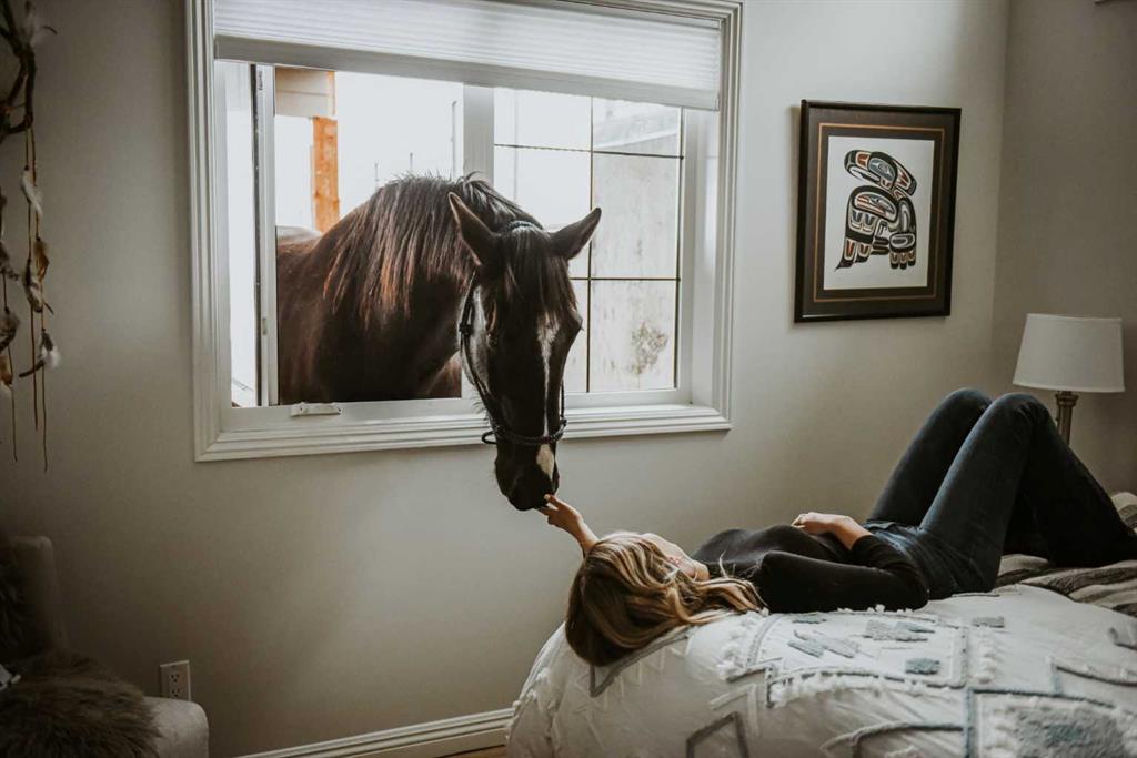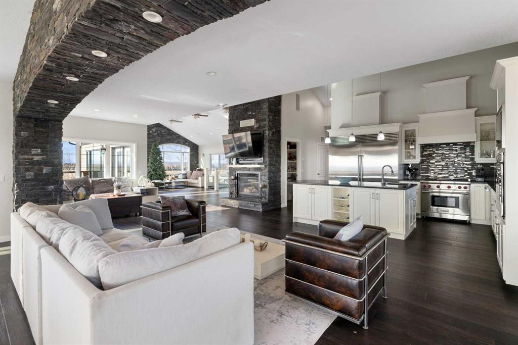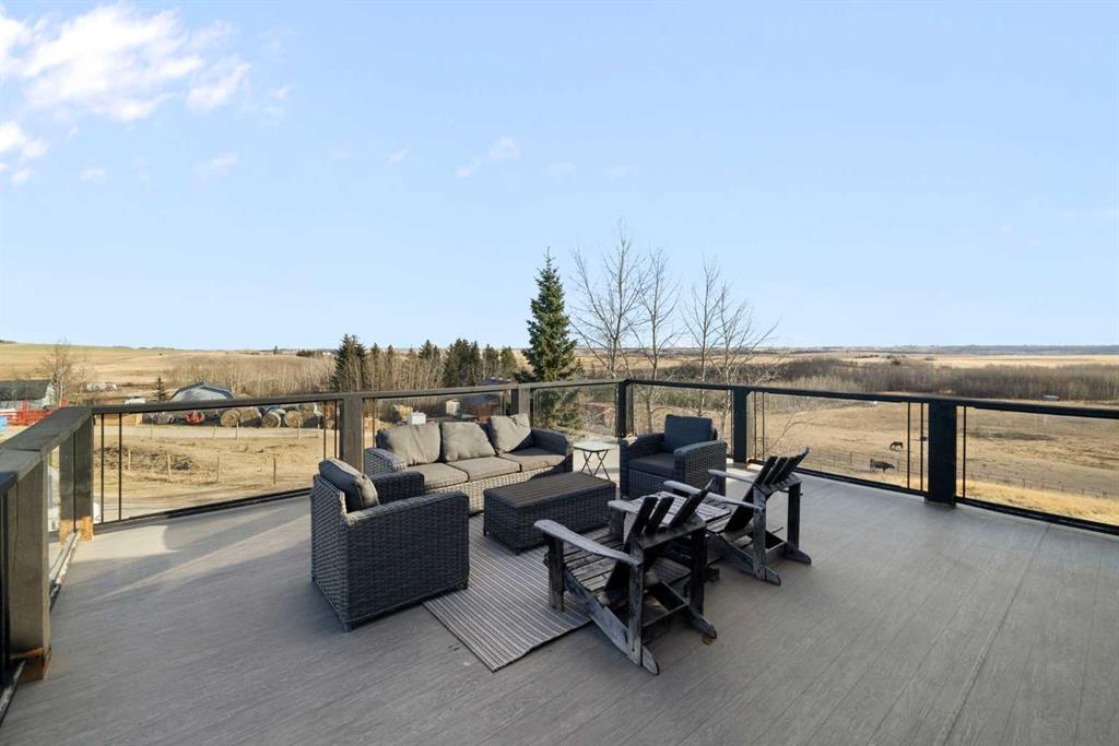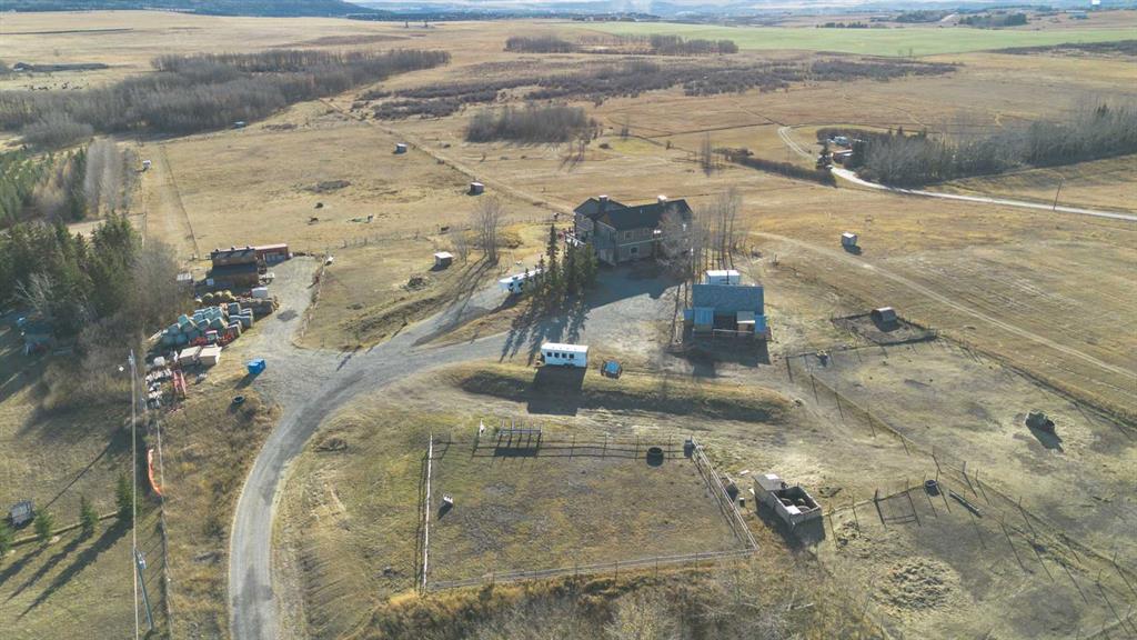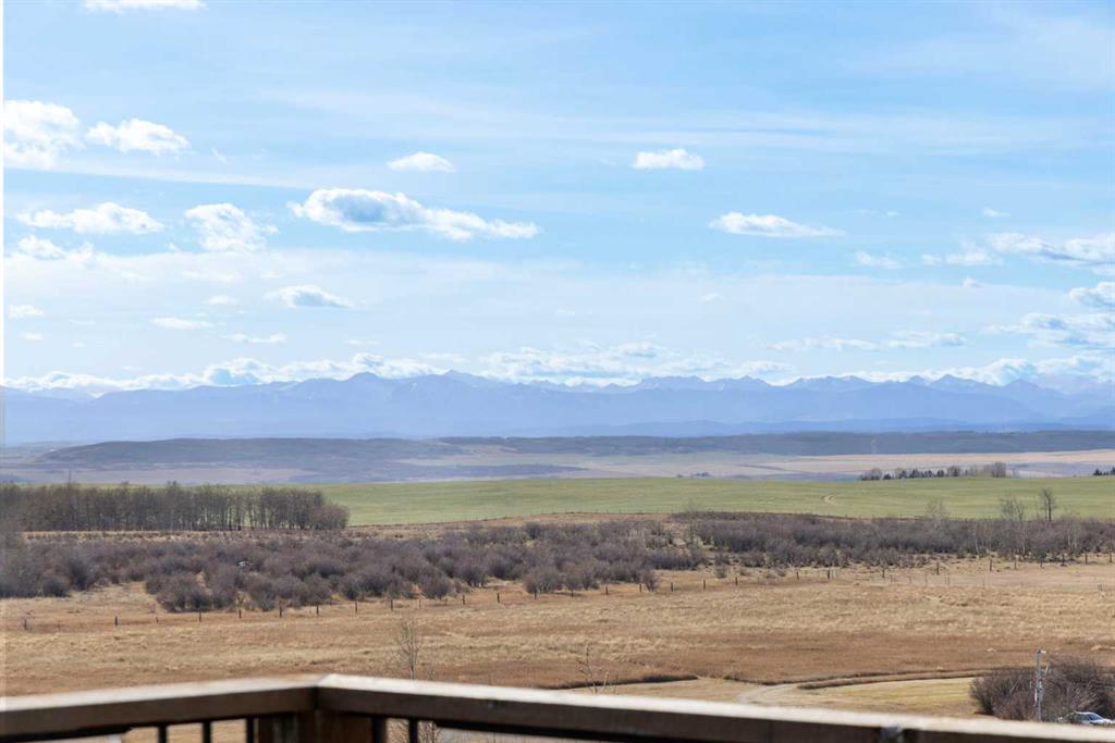 A lifestyle most only dream of! Historic Rocky Mountain views - just 8 minutes to Cochrane! Gorgeous custom-designed two-storey home featuring 4 bedrooms and 3.5 baths, with over 4900 sqft of developed living, AND 1,200 sq.ft. of wraparound decking on two levels. The main floor offers a smart, functional layout with three spacious bedrooms, including a massive primary retreat complete with a huge walk-in closet and luxurious 4-piece ensuite. Two additional bedrooms share another 4-piece bathroom with convenient main-floor laundry. Upstairs, the panoramic mountain views steal the show. The open-concept living space features 20-ft beamed ceilings, a cozy fireplace with built-in bench seating, and direct access to the south-facing deck. The chef-inspired kitchen showcases a full-size Sub-Zero fridge and freezer, granite island with seating, pot-filler over a Wolf six-burner gas range, walk-in pantry, and thoughtful design for everyday family life or large gatherings. The dining area, surrounded by three walls of windows, opens through French doors to another expansive deck — perfect for entertaining or soaking up the scenery. The walkout lower level expands your living options with a spacious one-bedroom suite (approx. 1,450 sq.ft.) featuring an open kitchen, dining, and living area, plus a media room/office, 3-piece bath, and laundry. A private entry makes it ideal for extended family, a caregiver, and successful short/long-term rental income. An interior locking door provides flexibility and security. Lots of options here. The oversized two-storey heated garage with attached carport ensures ample parking and storage. Outdoors, this fully fenced property includes manual entry gates, a quonset, and a charming barn with box and standing stalls, tack room, and loft (no power). Multiple paddocks, pastures with auto-waterers, two horse shelters, and a fenced dog run complete the setup. Enjoy peaceful rural living just minutes from Cochrane — with school bus service, shopping, and entertainment nearby. A short drive takes you to the Rockies and Alberta’s best outdoor playground. Book your private viewing today — this property truly needs to be experienced in person.