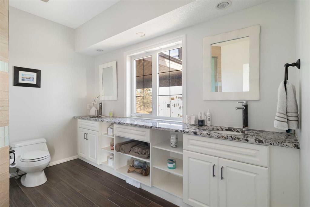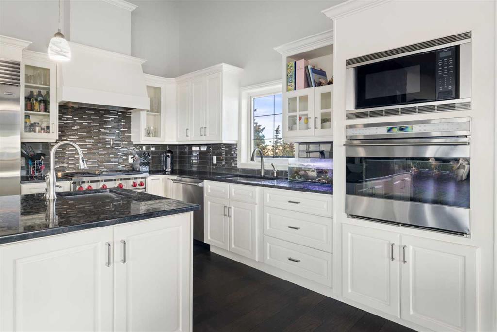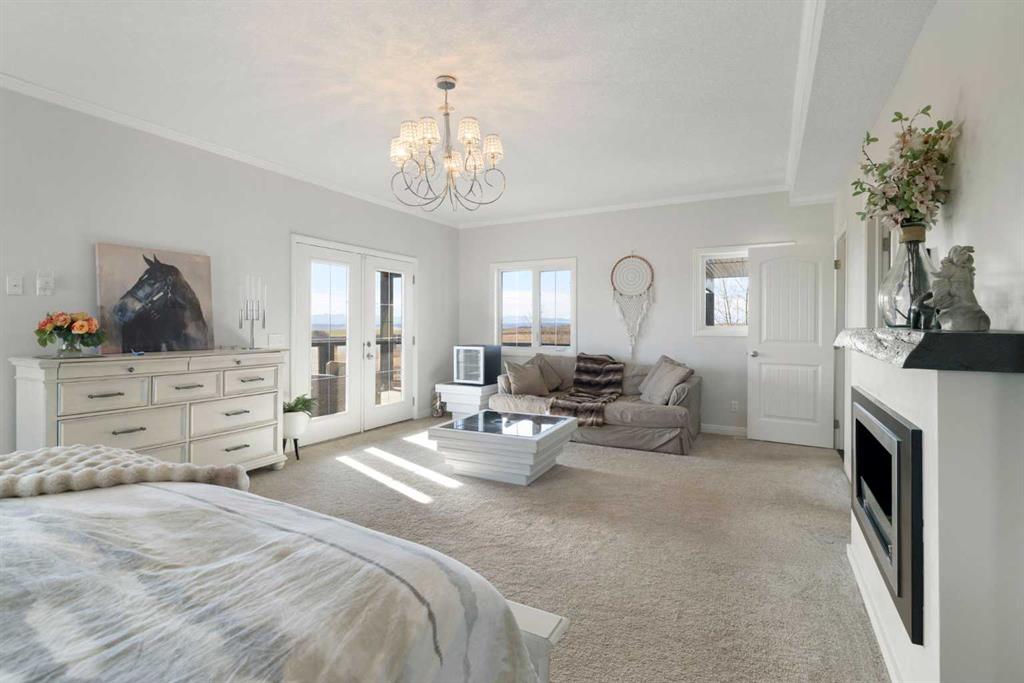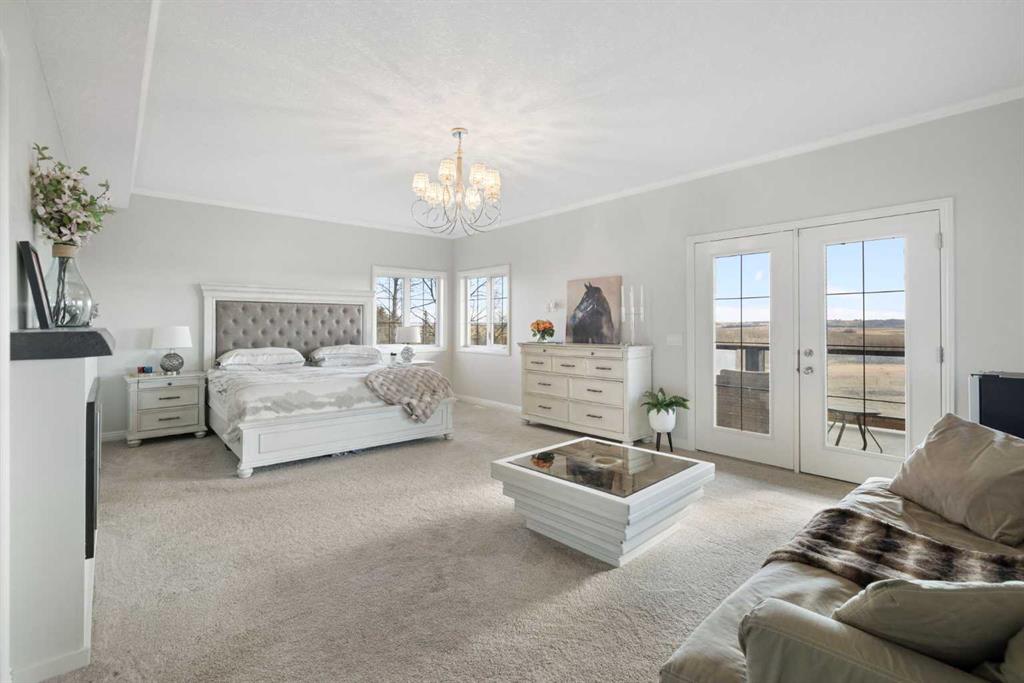 A lifestyle most only dream of! Historic Rocky Mountain views - just 8 minutes to Cochrane! Gorgeous custom-designed two-storey home featuring 4 bedrooms and 3.5 baths, with over 4900 sqft of developed living, AND 1,200 sq.ft. of wraparound decking on two levels. The main floor offers a smart, functional layout with three spacious bedrooms, including a massive primary retreat complete with a huge walk-in closet and luxurious 4-piece ensuite. Two additional bedrooms share another 4-piece bathroom with convenient main-floor laundry. Upstairs, the panoramic mountain views steal the show. The open-concept living space features 20-ft beamed ceilings, a cozy fireplace with built-in bench seating, and direct access to the south-facing deck. The chef-inspired kitchen showcases a full-size Sub-Zero fridge and freezer, granite island with seating, pot-filler over a Wolf six-burner gas range, walk-in pantry, and thoughtful design for everyday family life or large gatherings. The dining area, surrounded by three walls of windows, opens through French doors to another expansive deck — perfect for entertaining or soaking up the scenery. The walkout lower level expands your living options with a spacious one-bedroom suite (approx. 1,450 sq.ft.) featuring an open kitchen, dining, and living area, plus a media room/office, 3-piece bath, and laundry. A private entry makes it ideal for extended family, a caregiver, and successful short/long-term rental income. An interior locking door provides flexibility and security. Lots of options here. The oversized two-storey heated garage with attached carport ensures ample parking and storage. Outdoors, this fully fenced property includes manual entry gates, a quonset, and a charming barn with box and standing stalls, tack room, and loft (no power). Multiple paddocks, pastures with auto-waterers, two horse shelters, and a fenced dog run complete the setup. Enjoy peaceful rural living just minutes from Cochrane — with school bus service, shopping, and entertainment nearby. A short drive takes you to the Rockies and Alberta’s best outdoor playground. Book your private viewing today — this property truly needs to be experienced in person.