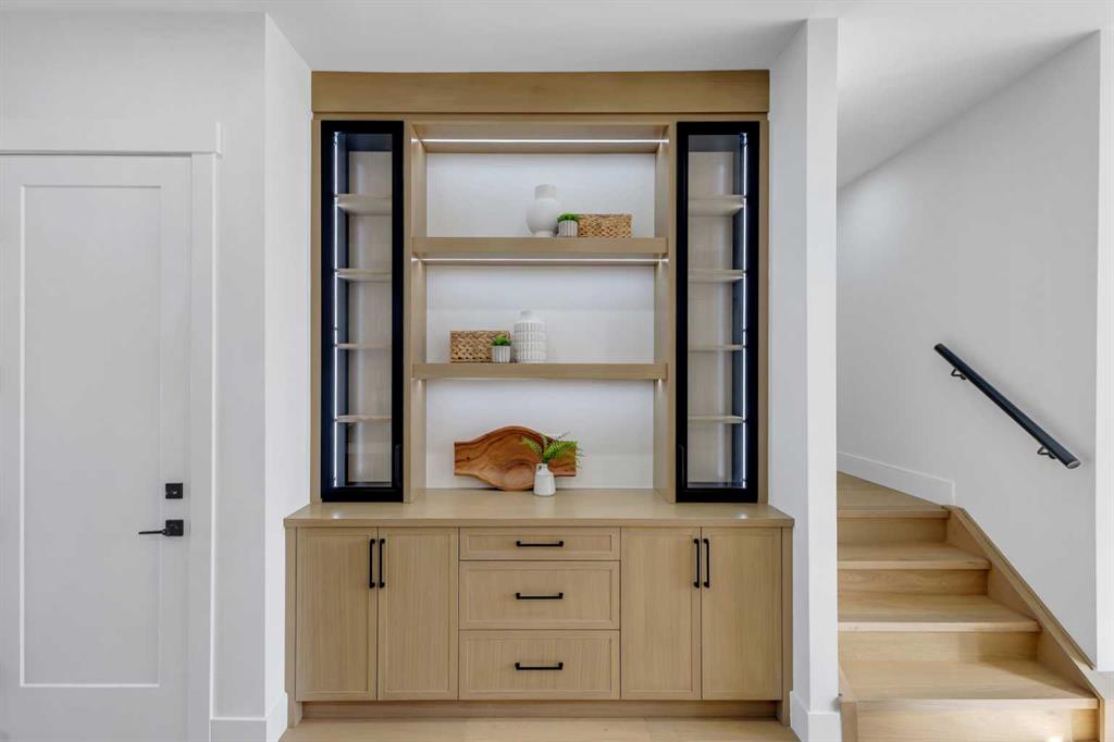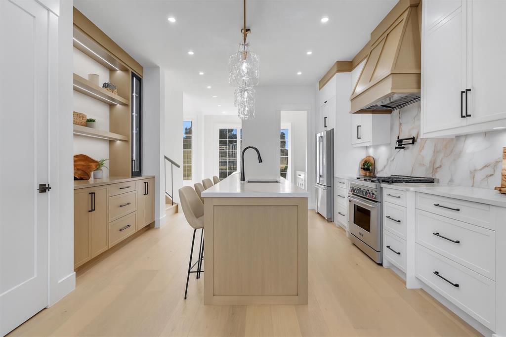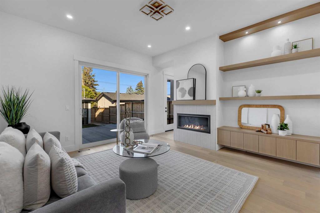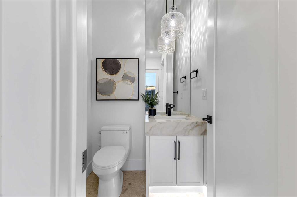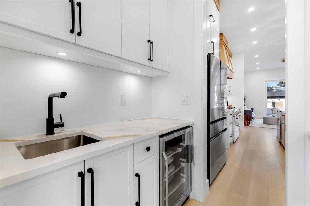 Don’t miss this stunning modern infill in the heart of ROSSCARROCK, designed with HIGH-END FINISHES, a WALKTHROUGH BUTLER’S PANTRY, and a RARE 3-BED, 2-BATH LEGAL LOWER SUITE (approved by the city). With a functional open-concept layout, upscale details, and a prime inner-city location, this home delivers a perfect blend of style and practicality. The spacious foyer welcomes you inside with direct access to the formal dining area, bathed in natural light from oversized windows, making it an ideal space for hosting gatherings or enjoying everyday meals. A walkthrough butler’s pantry seamlessly connects the dining room to the chef’s kitchen, offering custom cabinetry, a beverage fridge, a sink, and additional storage—perfect for entertaining and meal prep. The kitchen itself is a showstopper, featuring ceiling-height cabinetry, quartz counters, a full-height backsplash, and a large central island with bar seating. A stainless-steel appliance package includes a French door fridge, gas cooktop, wall oven, microwave, and dishwasher, ensuring both function and style. More storage is offered by the eye-catching coffee station or wine area, enhanced with LED lighting and glass displays. A main floor home office off the kitchen adds even more convenience for a work-from-home set up. The bright and open living room is designed for comfort and elegance, featuring an inset gas fireplace with a full-height tile surround with built-in cabinetry, and sliding patio doors taking you out to the rear deck. The rear mudroom helps keep daily essentials organized, and an upscale powder room completes the main level. Upstairs, the primary suite is a true retreat with vaulted ceilings, expansive windows, and a spacious walk-in closet. The spa-like 5-pc ensuite is designed for relaxation, featuring heated tile floors, dual sinks, a freestanding soaker tub, and a walk-in shower with full-height tile surround. Two additional secondary bedrooms share a well-appointed 4-pc bath, while a nook on the landing provides the perfect study space and a full laundry room with extra storage ensures everyday convenience. The legal lower suite (approved by the city) is a standout feature, offering a private side entrance and modern finishes as the rest of the home. With 9-ft ceilings, engineered hardwood floors, 2 FULL BATHS AND 3 FULL BEDS, this suite is ideal for tenants, extended family, or additional living space! The 4-pc baths feature tub/shower combos with full-height tile surrounds. The open-concept kitchen and living area include quartz counters, custom cabinetry, a full-size fridge, electric range, and separate laundry. Rosscarrock is a vibrant inner-city neighborhood, offering quick access to downtown via Bow Trail, transit options like Westbrook C-Train Station, and fantastic shopping & dining on 17th Ave! Outdoor lovers will appreciate Edworthy Park, Douglas Fir Trail, and Shaganappi Point Golf Course, plus top-rated schools just minutes away! *Photos from show suite.