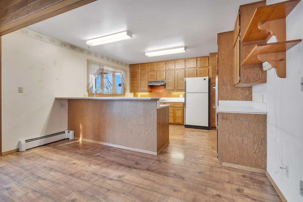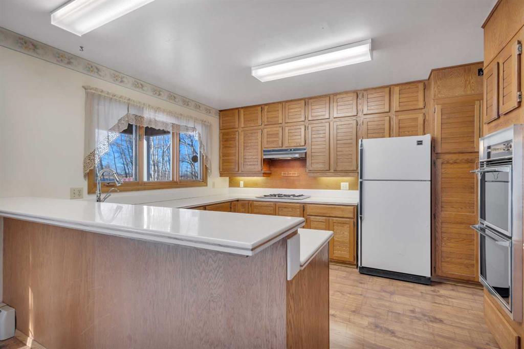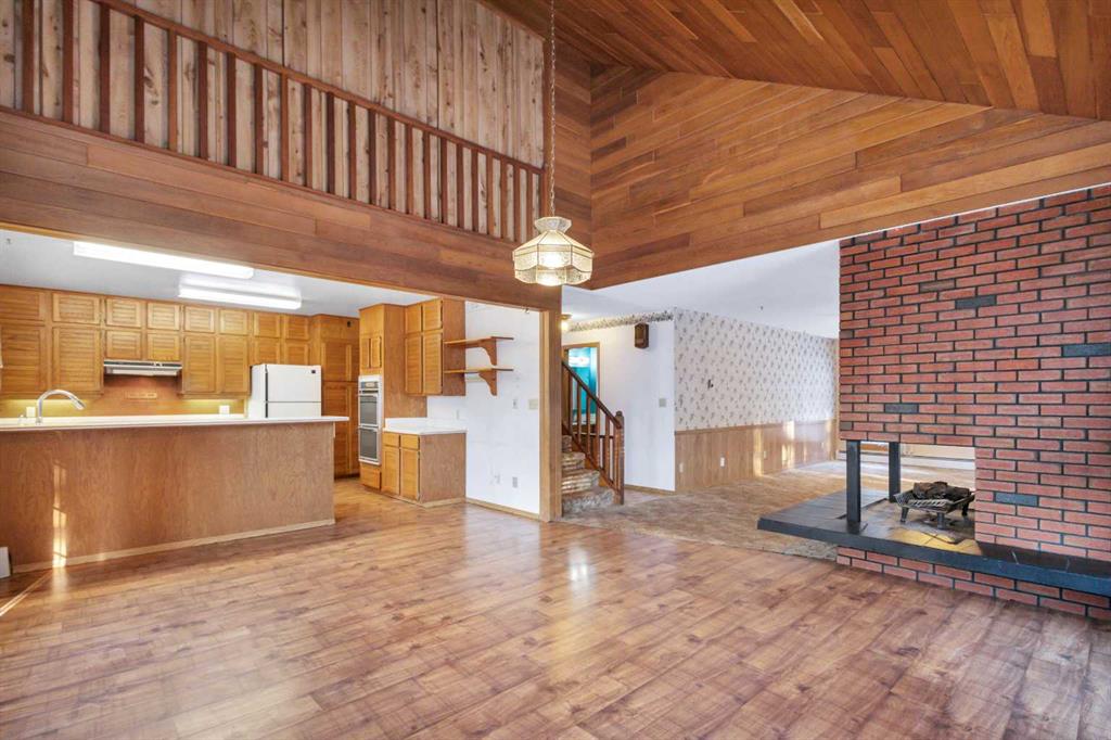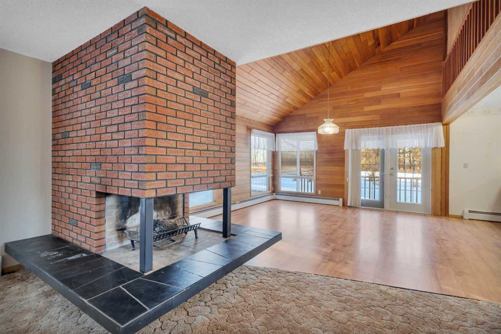 Visit REALTOR® website for additional information. Tucked away on 3.26 private acres, this spacious two-storey home with double detached garage, 220V power and woodburning fireplace offers a solid build, generous square footage, and a great location just 10 minutes from Rimbey. With 4 bedrooms, 2 full bathrooms, and a flexible layout suited to both everyday living and future possibilities, the property provides privacy, space, and the kind of setting and scale that’s becoming harder to find.From the moment you arrive, you’ll appreciate the wraparound deck—the perfect place to take in the peaceful surroundings and gorgeous views. Inside, the home features vaulted ceilings, warm pine accents, and beautiful wood paneling that create a welcoming, lodge-inspired feel. The heart of the main floor is anchored by an impressive three-sided natural wood fireplace, perfectly positioned to be enjoyed from the living and dining areas Large windows throughout the main level flood the home with natural light and frame the surrounding landscape. The kitchen offers natural hardwood cabinetry, a built-in gas range, and a built-in oven, and a pantry making it ideal for both everyday meals and entertaining. The dining room and living room both enjoy lovely views, adding to the home’s sense of openness and connection to nature. The primary bedroom is a true retreat, featuring a huge walk-in closet and its own private balcony—a perfect spot for morning coffee or quiet evenings. Downstairs, the basement offers excellent upside with the potential for two additional bedrooms (not included in RMS), and a walk-up basement exit that has been temporarily sealed but could easily be reopened. Outside, the double detached garage is equipped with 220V power and a wood-burning fireplace, making it a versatile space for hobbies, projects, or extra storage. A rare acreage opportunity combining size, character, and location—this is one you’ll want to see in person.
