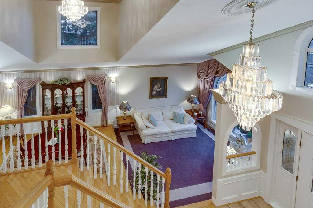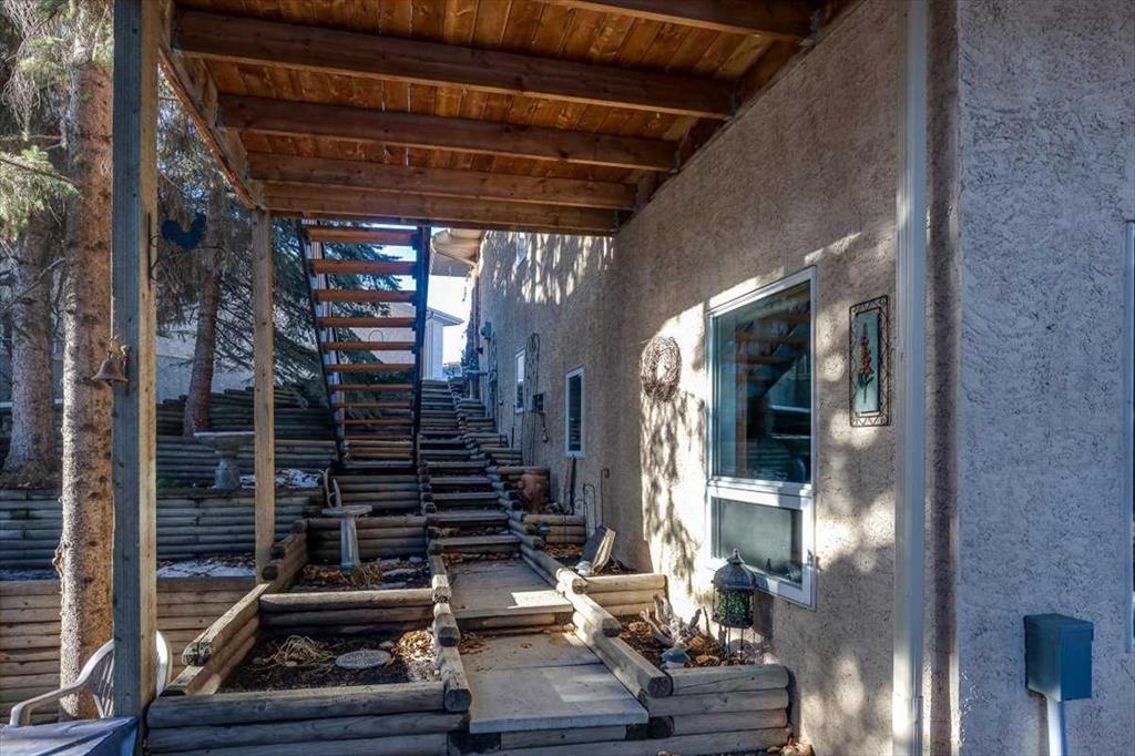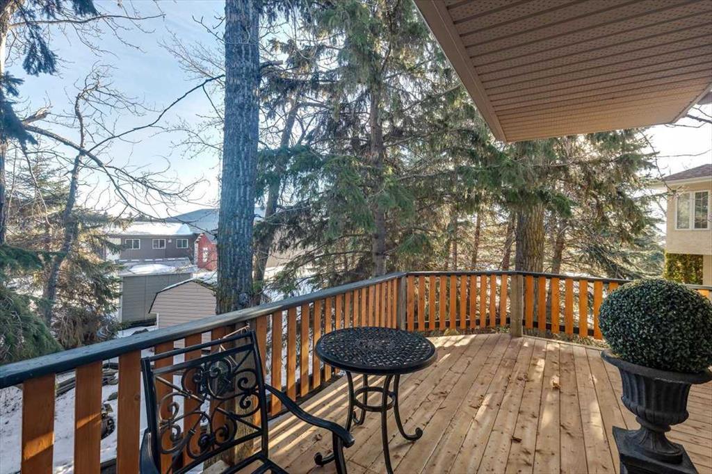 There is truly nothing else like this home on the market in Innisfail. Nestled in a private, forest-like setting right in town, this architectural masterpiece blends timeless elegance with natural serenity. From the moment you arrive, the extra-large front parking pad, accommodating three or more vehicles alongside the heated double garage, sets the tone for a property that balances luxury and practicality. Inside, the main level impresses with a cathedral ceiling foyer, chandelier, and refined details throughout. Ceiling medallions, crown mouldings, ledge lighting, and mosaic tile accents add sophistication, while hardwood flooring, custom wool carpeting, and Hunter Douglas window treatments elevate every room. The sunken living room exudes warmth, while the formal dining room glows with Murray Feiss lighting. The gourmet kitchen features abundant solid oak cabinetry, a gas stove, a Jenn-Air microwave/oven combo (gas hookup available/present), and a bay-window breakfast nook overlooking the treed backyard. Adjacent, the family room features a gas fireplace and a picturesque sitting area, creating an intimate gathering space. A captivating feature is the year-round sunroom, accessed through French doors, where walls of windows flood the space with natural light and frame uninterrupted views of the backyard oasis. A main-floor office or bedroom with custom-built-ins, a powder room, and a spacious laundry with sink and garage access complete this level. The primary suite occupies the upper floor, offering a private retreat at the top of its own grand staircase. A sitting area leads into the expansive bedroom with a walk-in closet, a hidden ironing board, a laundry chute, and a spa-inspired ensuite with a jetted soaker tub, Roman taps, and a shower. The walkout lower level evokes the feel of a luxury mountain retreat with beadboard, wainscoting, and cabin-like textures. The rec room, with 11-foot ceilings and a gas fireplace, is designed for entertaining, featuring a wet bar, built-in cue racks, and space for a pool table. Two additional bedrooms share a Jack-and-Jill four-piece bath, while above-grade windows and built-in organizers add both light and function. Outdoors, a wraparound deck with a natural gas BBQ hookup extends living into the treetops, perfect for entertaining or quiet mornings. Additional highlights include low-voltage outdoor lighting, retractable garden hoses, a wood retaining wall, two sheds, and wiring for a hot tub. The setting itself is unmatched—a private wooded escape that feels miles from town while only minutes from every amenity. Comfort and peace of mind come with in-floor heating in both the house and garage, many updated vinyl windows, a boiler-fired hot water tank (approx. 8 years old), and the roof was replaced in 2022. This home is a rare offering. Refined, timeless, and surrounded by nature, yet designed for modern living and entertaining. A sanctuary unlike any other, where classic elegance and a private forest retreat become one.