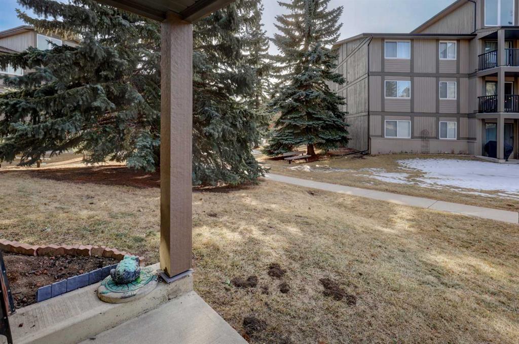 This home is perfectly located in a beautiful park like setting with large spruce trees and green space. Enjoy sunny days on your private patio that flows into the grassy courtyard area. The kitchen was recently renovated featuring white shaker cabinets for maximum light reflection in the well appointed space. There are plenty of counter and cupboards including a huge walk-in pantry. Dining area is bright spacious and open to the main living space. Relaxing living room with electric fireplace and sliding glass doors that look out to the green space make this condo a rare find. The bedrooms and bathroom are just a short distance down the hall creating privacy for this part of the home. Another wonderful features of this condo is the primary bedroom that easily accommodates a king size bed and still leaves plenty of room for other furniture. The full wall size closet completes this room. The second bedroom makes a great home office, guest or kids room. Laundry is full size and conveniently accessible in the bathroom. The unit sits in a location that feels like a single family home with a lovely backyard. Parking is right outside the front door. Fantastic area in the heart of Coach Hill. Easy access to shopping, transit, downtown and the mountains.
