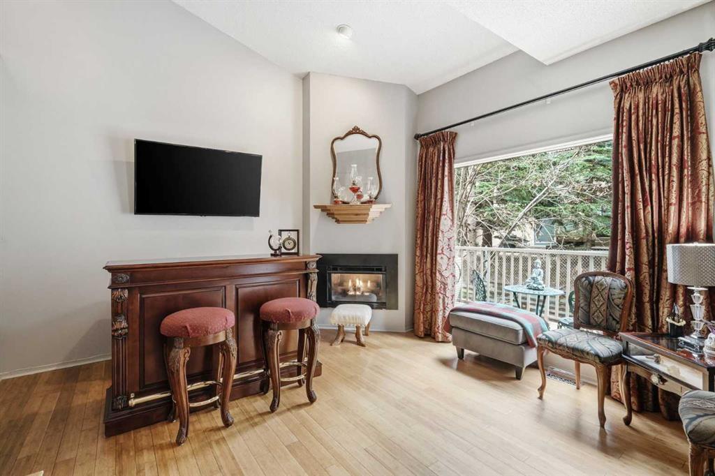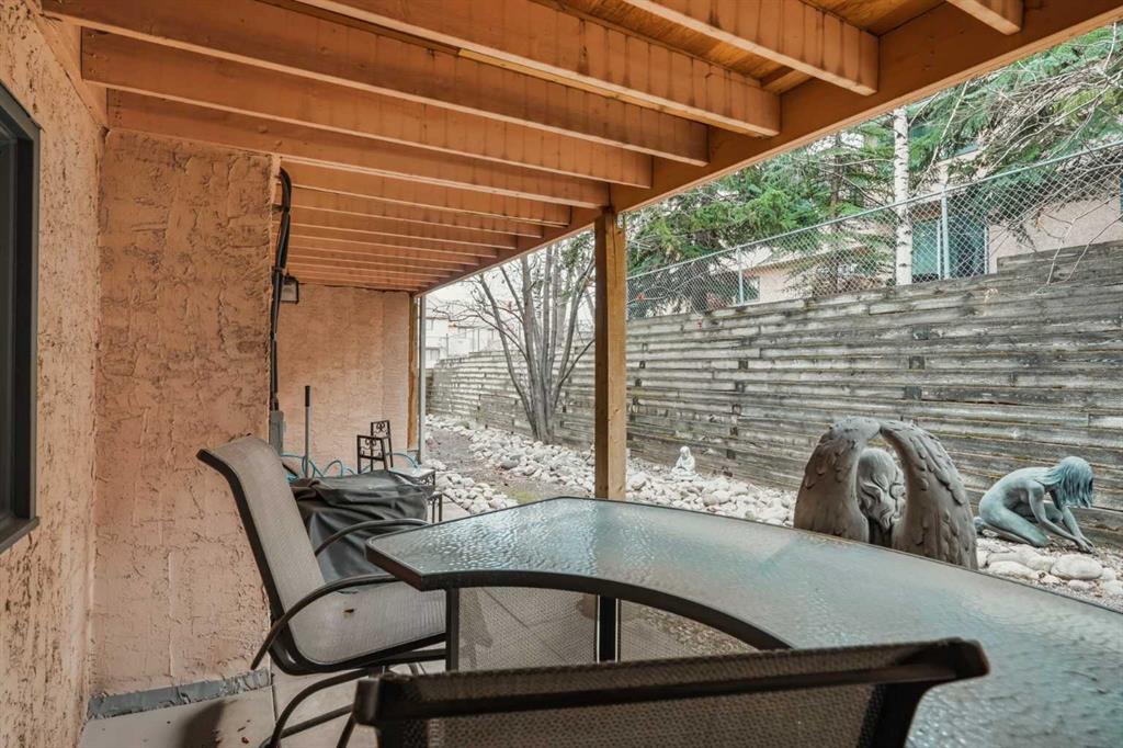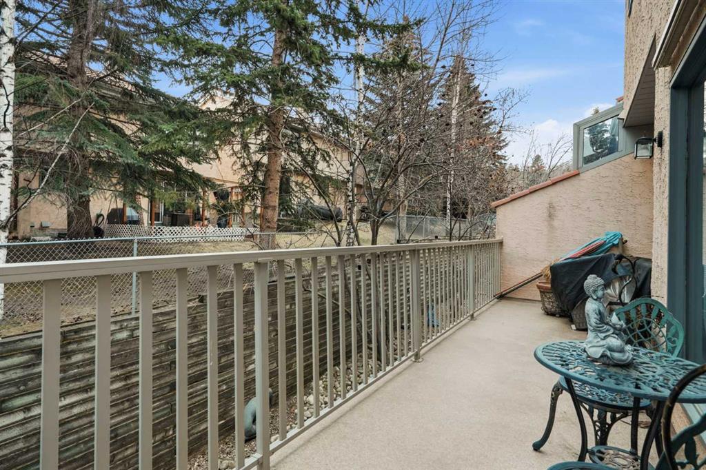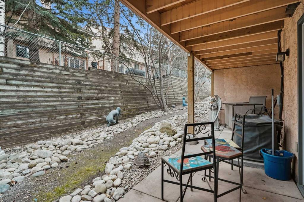 **Open House Sunday, April 26, 2–4 PM** Welcome to this beautifully maintained 2-bedroom, 3-bathroom townhome in the highly sought-after community of Patterson, offering a rare combination of privacy, functionality, and low-maintenance living just minutes to downtown. This thoughtfully designed home features two spacious primary bedrooms, each with its own ensuite, making it ideal for professionals, roommates, or guests. The main level showcases vaulted ceilings, bamboo flooring, and a bright, open-concept living space centered around a cozy gas fireplace. The kitchen is both functional and stylish, featuring sleek black cabinetry, a unique stainless steel countertop, ample storage, and a newer dishwasher (2024)—a modern, design-forward space that stands out from the ordinary. Enjoy your own private, tranquil outdoor setting with both an upper deck and a lower walkout patio—perfect for relaxing or entertaining. The fully finished walkout basement adds incredible flexibility, featuring a large recreation/media room with a second fireplace (wood-burning with gas log lighter), a spacious finished laundry room, and a dedicated hot tub room with capped plumbing (not currently in use), plus direct outdoor access. Additional highlights include new furnace and central A/C (2023), Poly-B plumbing replaced, new bedroom windows, and a single attached garage, all within a pet-friendly, well-managed complex with low condo fees. Ideally located in a quiet, green space setting with quick access to downtown, Westhills, Aspen Landing, C-Train, and major routes.