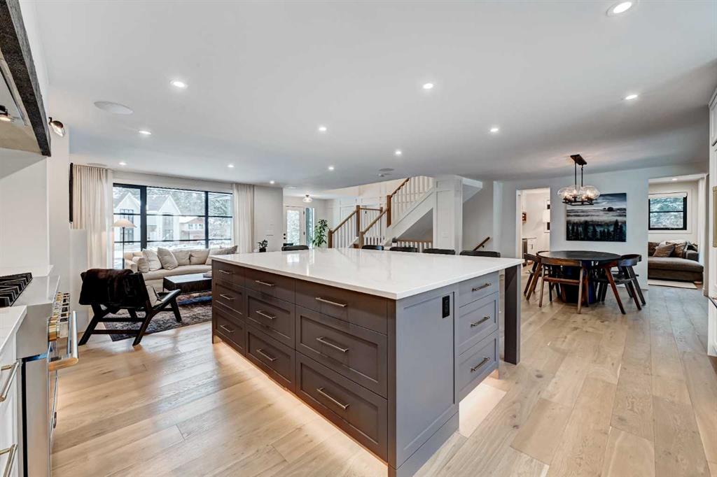Rare opportunity in Lakeview Village to own a fully rebuilt home (2025) situated on one of the community’s largest lots—a 17,200 sq. ft. pie-shaped property backing directly onto the west side of North Glenmore Park. This exceptional custom residence offers approximately 3,700 sq. ft. of developed living space, with architecture by Andison Residential Design, interiors by Lori Sellmer, and construction by Ashwood Built. Over $1M has recently been invested in a complete transformation of this exclusive home. The property features 6 bedrooms, 3 full bathrooms, and 1 powder room, along with a new upper-level laundry room and an additional laundry area in the lower level. Nearly every component has been updated, including insulation, triple-pane windows, mechanical systems, plumbing, and electrical. Hardwood flooring extends throughout the main and upper levels. The main floor showcases an open-concept kitchen, dining, and living area, complemented by an enclosed office, additional den/flex space, powder room, and large mudroom including custom built-ins with direct access to the attached garage. The upper level offers 4 bedrooms and 2 full bathrooms, including a spacious primary suite with a large walk-in closet and full ensuite; all upper bathrooms feature in-floor heating. The lower level includes 2 additional bedrooms, a full bathroom, and a generous flex/recreation space. Exterior upgrades include new Hardie board siding with stone accents, new roof shingles, a covered Trex composite deck, and a fully installed irrigation system for both front and rear yards, along with direct gated access to North Glenmore Park. The attached garage is equipped with an additional electrical panel and is vehicle charging ready. Other notable features include central A/C, gas fireplace, custom window coverings, built in speakers in and out, water softener, kitchen drinking water filtration, on demand hot water, cover rear patio, & 200 amp service. This is a rare chance to own a move-in-ready home in a highly sought-after location.