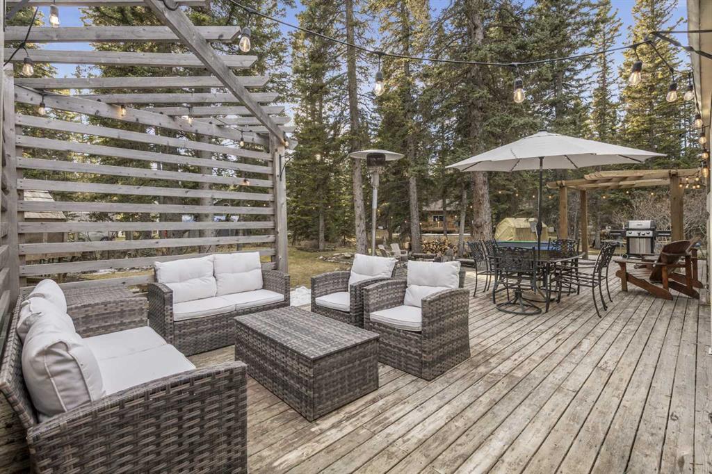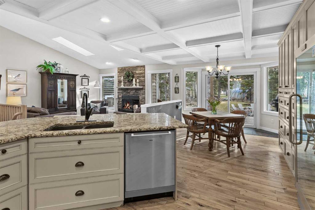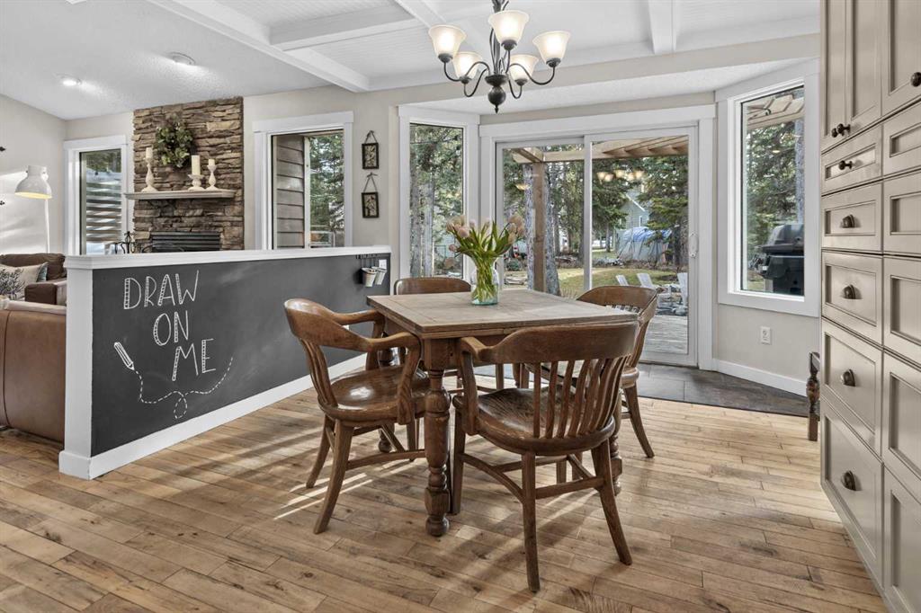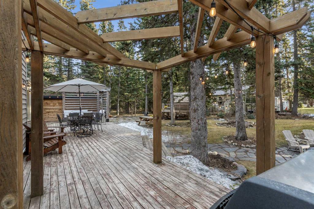 Tucked among mature trees on a picturesque .37 acre lot in Redwood Meadows, this spacious bungalow offers a relaxed, welcoming feel where timeless design meets everyday comfort. Thoughtfully laid out, the home showcases warm hardwood floors, an updated kitchen with granite counters and exceptional storage, and effortless entertaining in the expansive dining room. Inviting living spaces are anchored by a wood-burning fireplace in the main floor living room and cozy wood stove on the lower level—a perfect way to wind down in the evening. The primary suite is a true retreat, complete with a walk-in closet, spa-like 6-piece ensuite, and private access to the sunny, South facing rear deck. The fully developed lower level provides a generous rec room, oversized bedrooms, and plenty of storage for busy households. Outdoors, the property shines with a front porch, massive back deck, flagstone paths, perennial gardens, firepit, and space to enjoy both lawn and trees, all complimented by a double attached garage, garden shed, and dog run. Life in Redwood Meadows extends well beyond your front door, offering a vibrant, close-knit community with year-round recreation & activities, riverside walking trails along the Elbow River, Redwood Meadows Golf & Country Club, skating rink, playgrounds, tennis courts, playing fields and community centre (Redwood House) —an exceptional setting for those who value nature, connection, and an active lifestyle.