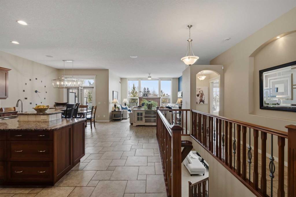 Executive WALKOUT BUNGALOW on a private OVERSIZED LOT in a park-like setting. Located in Elgin Estates BACKING ONTO WALKING PATHS with serene POND VIEWS. This beautifully maintained home features 10’ CEILINGS, CUSTOM 8’ DOORS & TRIM, with built-in CEILING SPEAKERS throughout. The MAIN FLOOR includes a stunning OFFICE with glass French doors, a spacious living room anchored by a GAS FIREPLACE with LARGE WINDOWS overlooking the backyard. The bright dining area with PATIO DOORS and transom window leads to the full width deck to enjoy outdoor dining. The upscale kitchen offers warm wood cabinetry, GRANITE countertops, UNDERMOUNT LIGHTING, abundant drawers, a built-in WINE RACK, and corner pantry—perfect for entertaining. The primary suite captures stunning backyard and pond views through floor-to-ceiling windows and includes a luxurious 5-PC ENSUITE with dual sinks, soaker tub, and WALK-IN CLOSET with CUSTOM BUILT-INS. The MAIN FLOOR LAUNDRY is complete with additional cabinets and storage with a sink for optimal convenience. The fully finished WALKOUT BASEMENT with IN-FLOOR HEATING provides a large family room for entertaining with a second GAS FIREPLACE. The SECONDARY OFFICE SPACE is host to built-in cabinetry, with two generous bedrooms, and a 4-pc bath perfect for the growing family or guests. A HOBBY ROOM WITH SINK (ideal for wine making) connects to a separate COLD ROOM, while the LARGE WORKSHOP features 240V power, its own ELECTRICAL PANEL, custom made workbench with loads of storage and the ability to be vented outside, creating endless opportunities for a future kitchen or home gym. Additional highlights include TRIPLE-PANE windows, central A/C, underground SPRINKLERS with Bluetooth control, GEMSTONE EXTERIOR LIGHTING, Dura-deck with glass railing, and a covered lower patio. The professionally designed and thoughtfully landscaped private backyard with WATER FEATURE completes the PARK-LIKE SETTING. Completing the home is an OVERSIZED double attached GARAGE with built-in WORKBENCH, drawers and shelving. A rare opportunity to own a meticulously maintained executive bungalow with PREMIUM FEATURES, exceptional outdoor space and convenient access to Stoney Trail.