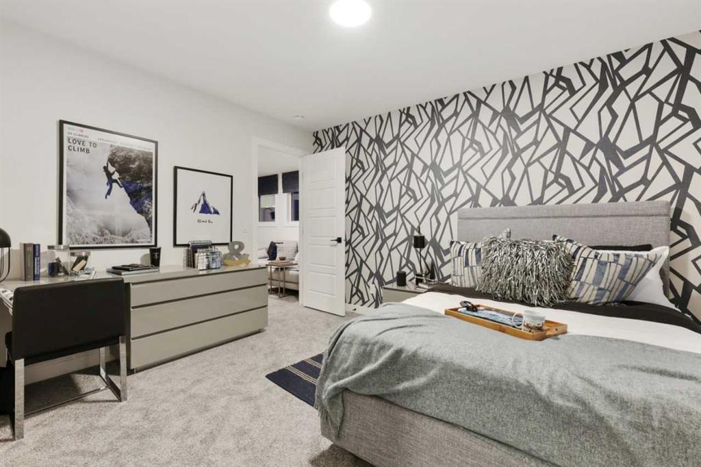 Welcome to the Abbott by Sterling Homes Calgary, this beautifully upgraded home offering modern finishes, functional design, and exceptional comfort throughout. Built by a trusted builder with over 75 years of experience, this home showcases on-trend, designer-curated interior selections tailored for a home that feels personalized to you. Energy efficient and smart home features, plus moving concierge services included in each home. The kitchen features stainless steel appliances, a chimney hoodfan with built-in microwave, single bowl Silgranit sink, pendant lighting, and a walk-in pantry with elegant French door. The main floor includes a bedroom and full bathroom—perfect for guests—along with a stylish electric fireplace accented by maple floating shelves. Upstairs, enjoy a vaulted bonus room and a stunning primary bedroom with tray ceiling and a 5-piece ensuite featuring a fiberglass base shower with tiled walls and niche, upgraded sinks, and a bank of drawers, with matching cabinetry in the main bath. Additional highlights include tile flooring in bathrooms, LVP throughout the main floor and upper common areas, quartz countertops with undermount sinks, maple railing with iron spindles, triple pane windows, extra windows for abundant natural light, a side entrance, 9’ basement wall height, and a BBQ gas line rough-in for future outdoor enjoyment. This energy-efficient home is Built Green certified and includes triple-pane windows, a high-efficiency furnace, and a solar chase for a solar-ready setup. With blower door testing, plus an electric car charger rough-in, it’s designed for sustainable, future-forward living. Featuring a full range of smart home technology, this home includes a programmable thermostat, ring camera doorbell, smart front door lock, smart and motion-activated switches—all seamlessly controlled via an Amazon Alexa touchscreen hub. Photos are a representative.