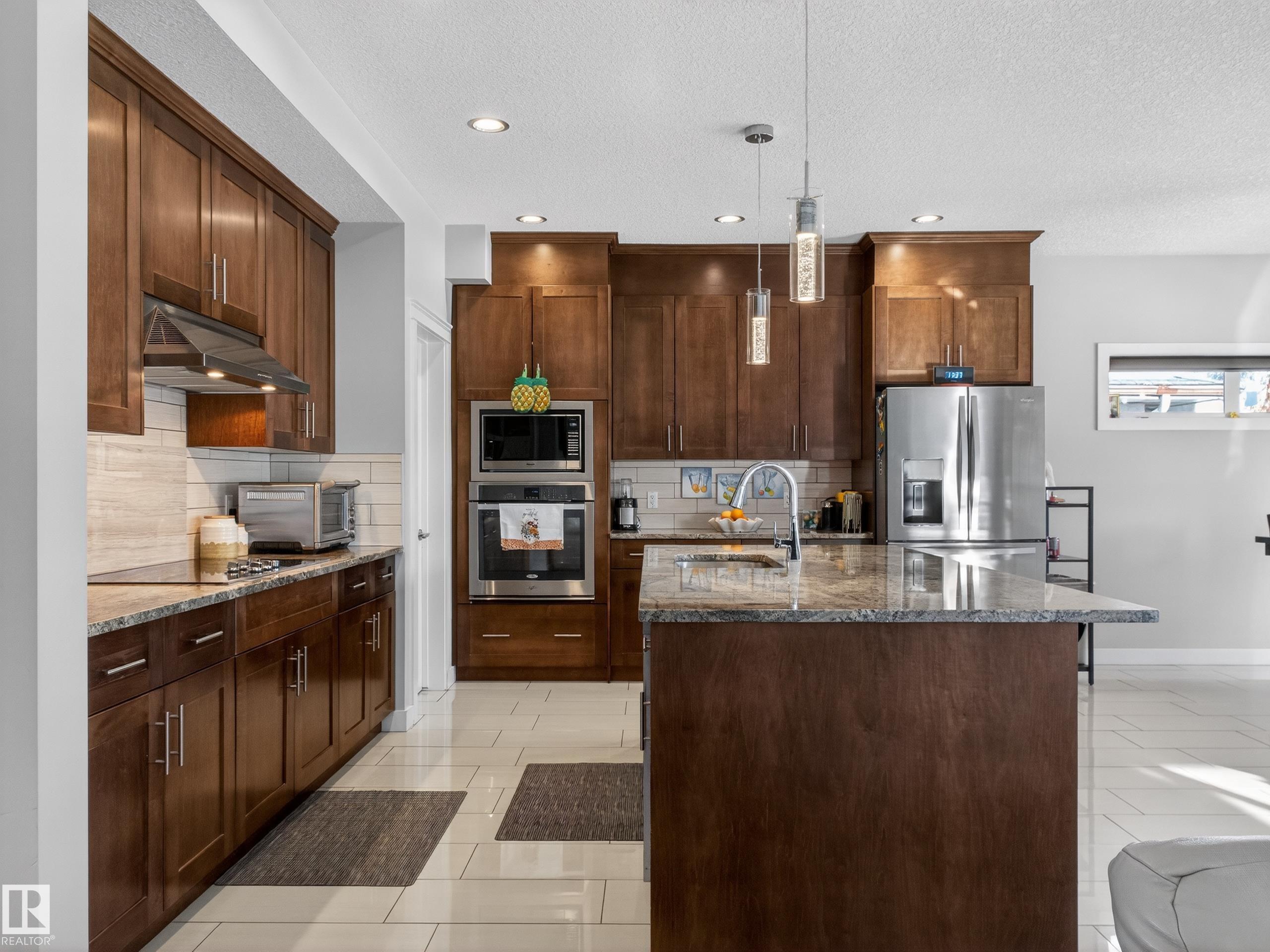 SHOWSTOPPER This custom centrally located home offers space, style, and income potential. Featuring 5 bedrooms, 5 bathrooms, plus a 1-bedroom legal suite, this property also boasts a triple detached garage and a truly luxurious main floor. Enjoy charming curb appeal with a welcoming front veranda, a flexible front living/flex room, and a main-floor bedroom with direct access to a full bath—ideal for guests or multigenerational living. The open-concept layout showcases a bright great room with backyard views, a cozy family room with gas fireplace, and an exceptional kitchen complete with breakfast bar, pantry, quality appliances, granite countertops, and maple cabinetry. Large windows, hardwood and tile flooring, and air conditioning add comfort throughout. Upstairs offers 4 bedrooms, laundry, and a spacious primary suite with a 5-piece ensuite featuring dual sinks, glass shower, and whirlpool tub. The fully developed basement includes a large family room with wet bar, 2-piece bath, and a separate suite