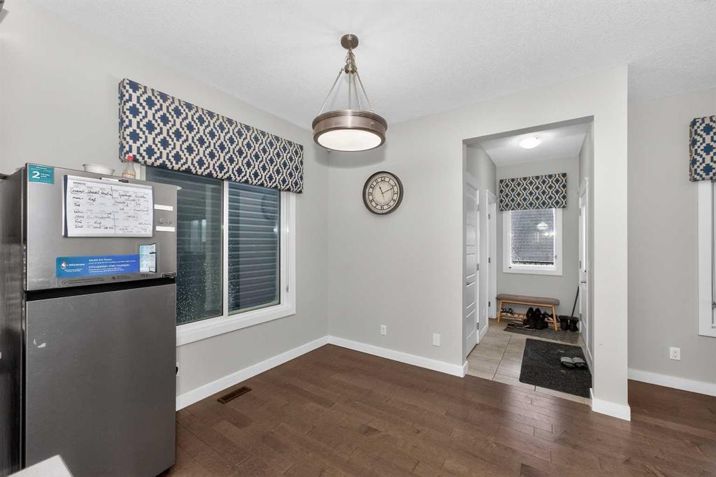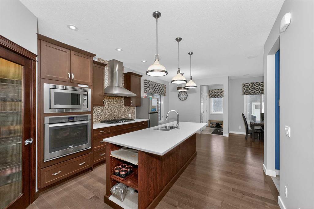 Discover this exceptional former showhome nestled in the highly desirable Cornerstone community, offering an impressive blend of space, upgrades, and location. This beautifully maintained residence features 5 bedrooms, 3.5 bathrooms, and a fully developed basement, providing approximately 2,513 sq. ft. of total living space. The home is fully air-conditioned and complemented by a spacious deck and a massive 25’ x 23’ double detached garage, ideal for parking, storage, and hobbies. Enjoy unmatched convenience with a playground just steps away and quick access to Stoney Trail, ensuring effortless commuting throughout the city. Upon entry, the home is filled with natural light streaming through expansive windows, creating a bright and welcoming ambiance. The main floor boasts 9-foot ceilings and offers two separate living areas, one enhanced by a gas fireplace, perfect for cozy evenings. Designed for both everyday living and entertaining, the open-concept kitchen showcases stainless steel appliances, including a gas cooktop, built-in oven, and microwave, along with a refrigerator and dishwasher. Elegant maple cabinetry, a pantry, and a large island featuring an undermount sink, wine storage, and additional cabinetry provide both beauty and functionality. Stylish pendant lighting, recessed lighting, and under-cabinet illumination complete the space. The main level is finished with hardwood flooring, while the staircases, upper floor, and basement are finished with soft carpeting for added comfort. Upstairs, the primary suite offers a private retreat with a custom built-in closet and a 4-piece ensuite featuring both a soaker tub and a separate standing shower. Three additional well-proportioned bedrooms and a full 4-piece main bathroom complete the upper level. The fully developed basement includes a large recreation area, ample storage, and a bedroom with a custom walk-in closet and a 3-piece ensuite, making it ideal for guests, extended family, or private use. Notable upgrades throughout the home include titanium wire shelving and railings, zebra blinds and window coverings, and a built-in speaker system. Security and peace of mind are enhanced with seven exterior security cameras and a Ring doorbell camera. An underground irrigation sprinkler system keeps the landscaping lush and well-maintained with ease. This remarkable property delivers comfort, functionality, and upscale finishes in a prime location. A rare opportunity not to be missed—book your private showing today and experience everything this home has to offer.