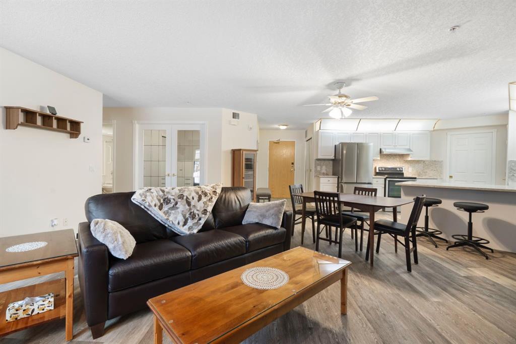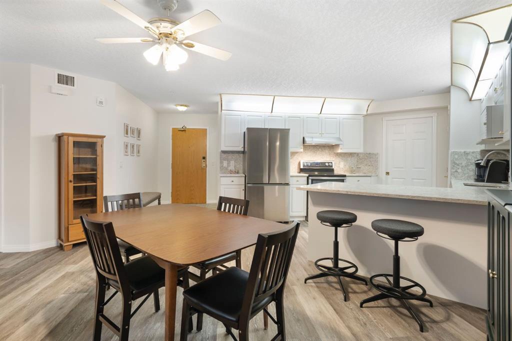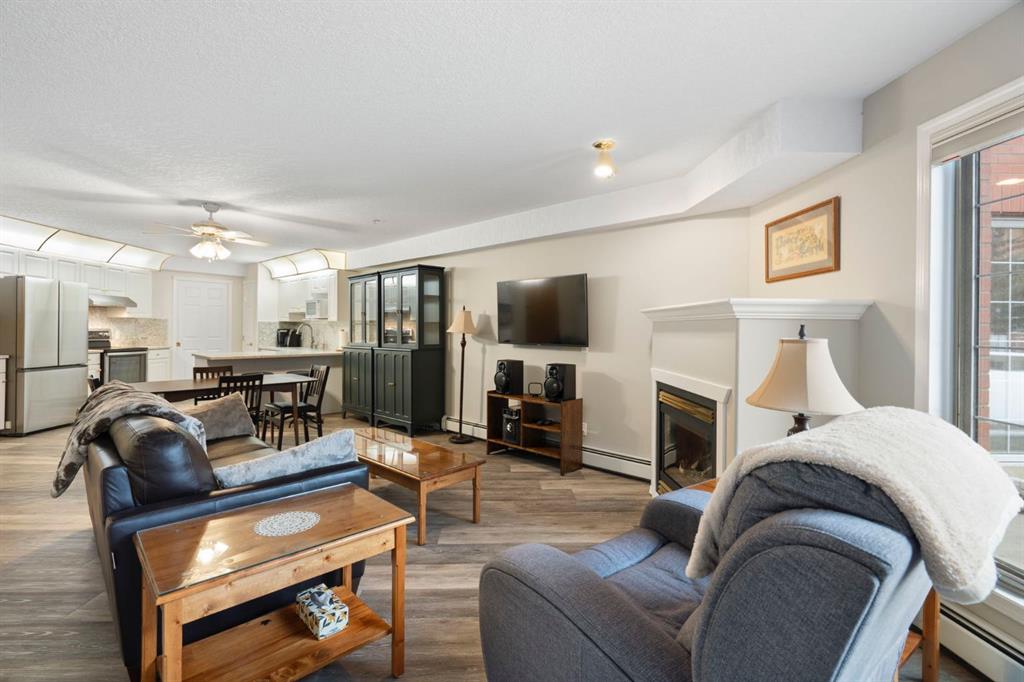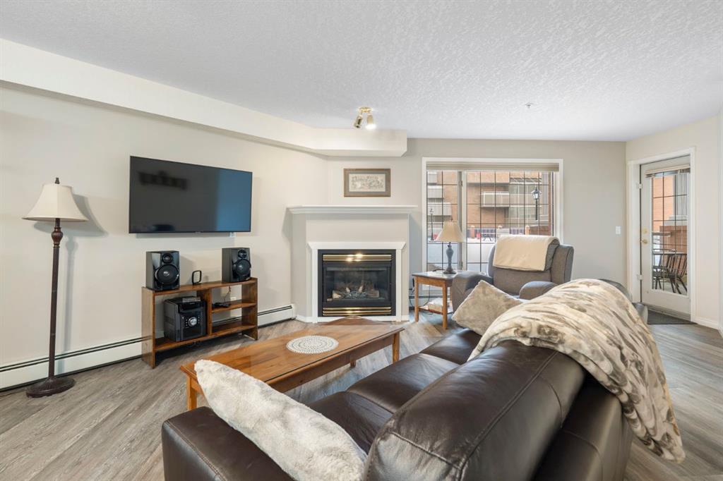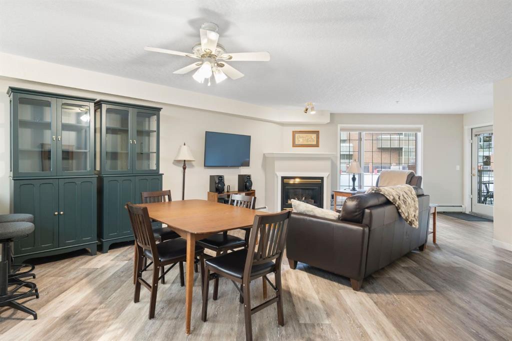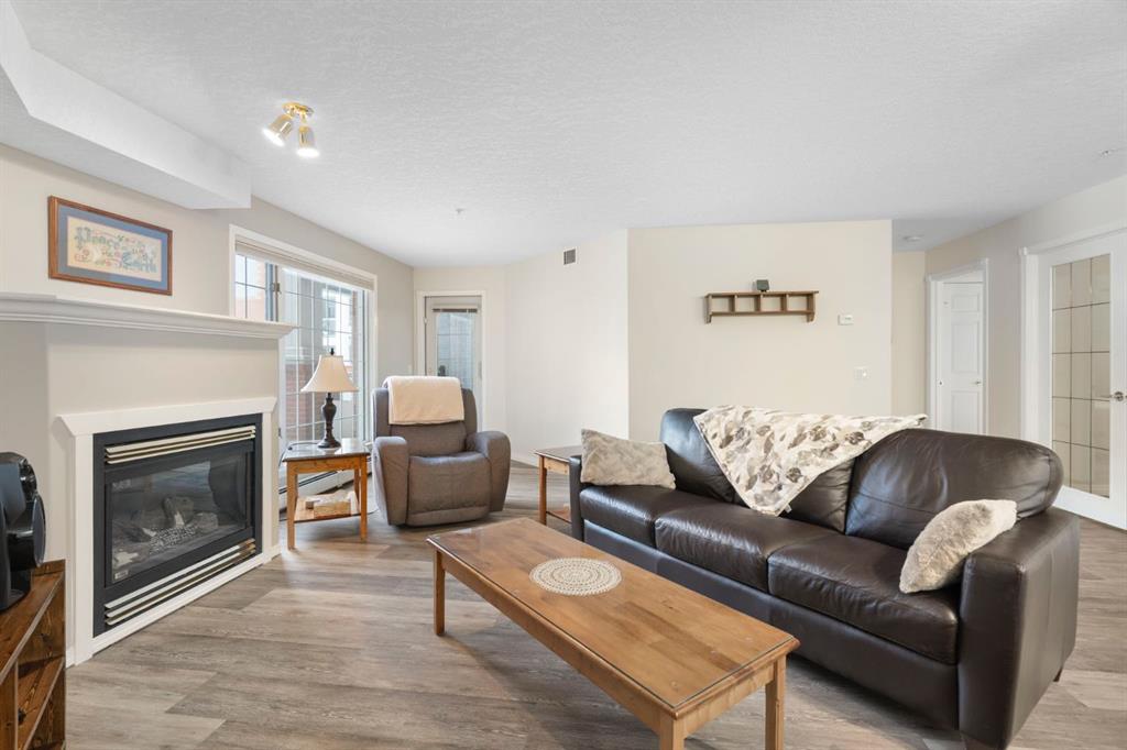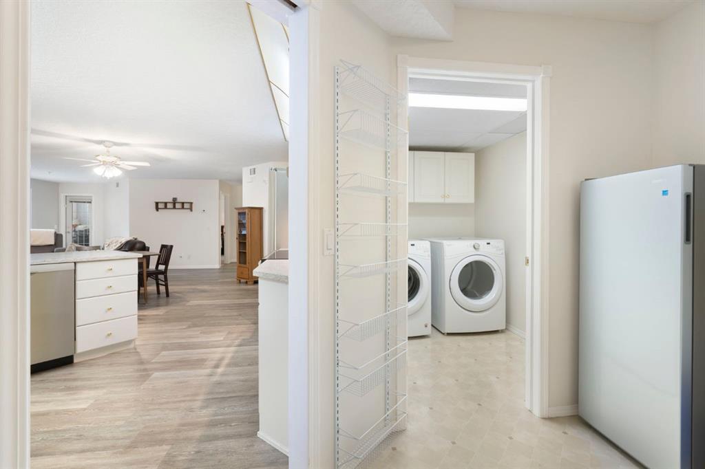 Located in one of the most desirable 55+ complexes the south has to offer, this amenities-loaded building provides a unique lifestyle that you'll be sure to enjoy... welcome to Sierra's of Heritage. This unit offers 2 bedrooms, 2 bathrooms, 2 parking stalls, an out-of-unit storage locker, a full-sized kitchen, direct access to the west-facing courtyard, and upgrades throughout! This complex conveniently INCLUDES ALL UTILITIES in the condo fee as well as the cost of all your luxurious amenities. At the entrance, you're welcomed with updated paint (2024) on the walls, ceiling, baseboards, and trim, vinyl flooring, a front closet, and a spacious open-floor concept. The large kitchen has been upgraded with newer appliances (2024) and newer quartz countertops with a matching quartz backsplash (2024). With plenty of cabinetry and a generous pantry, you'll be able to bring all your cooking appliances with you for this transition. Some of the cabinets have also been upgraded with roll-out drawers for easy access and convenience. Walking through your large pantry, you have an additional stand-up freezer and access to your laundry room with a side-by-side washer/dryer. Off the kitchen, you have a dining space that's open to your living room, featuring a gas fireplace and access to your ground-floor patio that has direct access to the west-facing courtyard! With this ground-floor unit, you no longer need to trade your backyard for a balcony; this unit provides the luxury of an outdoor living space that you can walk right onto and enjoy.Off the living space, you have the multi-purpose secondary bedroom or den/office, featuring french doors and a closet. Nearby, you also have an updated 4-piece bathroom and linen closet. The primary bedroom features a west-facing window, enough room for a king-sized bed, and a 4-piece ensuite with a proper walk-in closet. Both toilets have been upgraded to chair height. This unit eliminates the need to compromise. Offering a full-size kitchen, pantry, proper laundry room, courtyard access, and 1,160 sq/ft of living space, this is a great place to call home. The building amenities include a pool, hot tub, gym, library, craft room, theatre room, pool tables, poker table, dart board, car wash, bike storage, and an amazing woodshop.