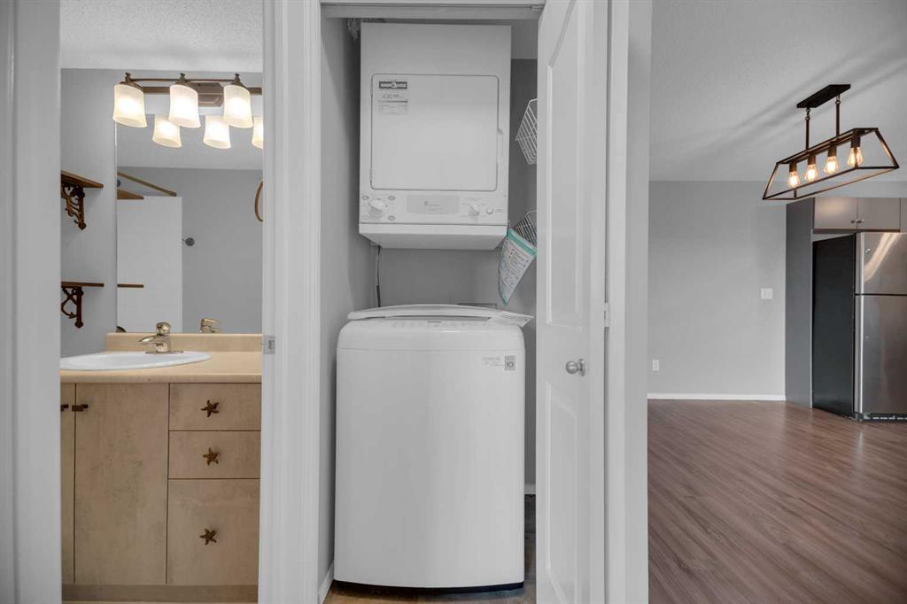 Welcome to this bright & stylish 2-bedroom, 2-bathroom condo with a versatile den — perfect for a home office or creative space! Huge feature - TWO PARKING STALLS!! This inviting home features a modern open-concept layout with trendy grey tones, stainless steel appliances, & plenty of natural light streaming through large patio doors off the living room. The spacious kitchen flows seamlessly into the dining & living areas, creating the ideal space for both everyday living & entertaining. Enjoy the convenience of in-suite laundry, a west-facing balcony for evening sunsets, & two assigned parking stalls — a rare find! Recent updates include: entire unit painted, new flooring in bathroom & ensuite and walk-in shower in ensuite. Located in the desirable community of Bridlewood, you’re close to parks, schools, shopping, and transit. You’ll love living here!!!