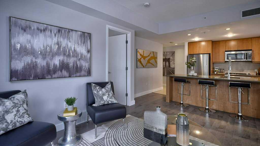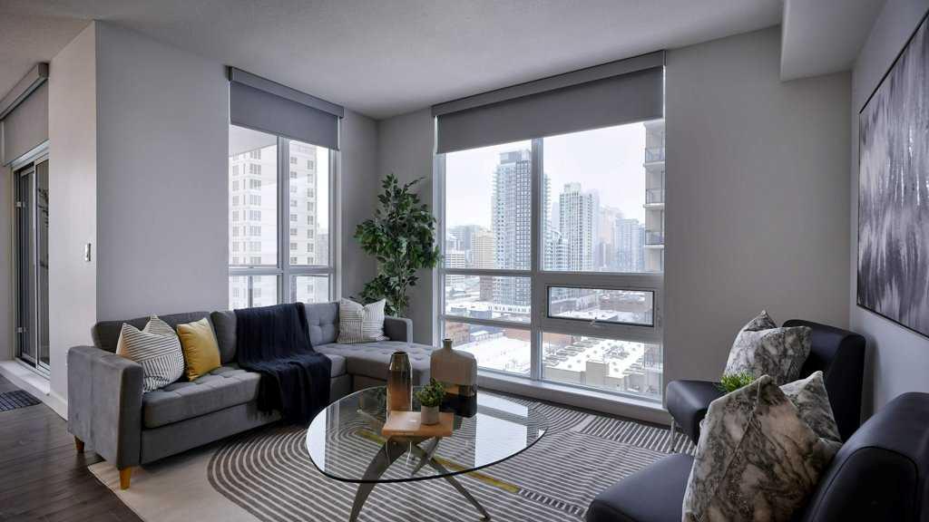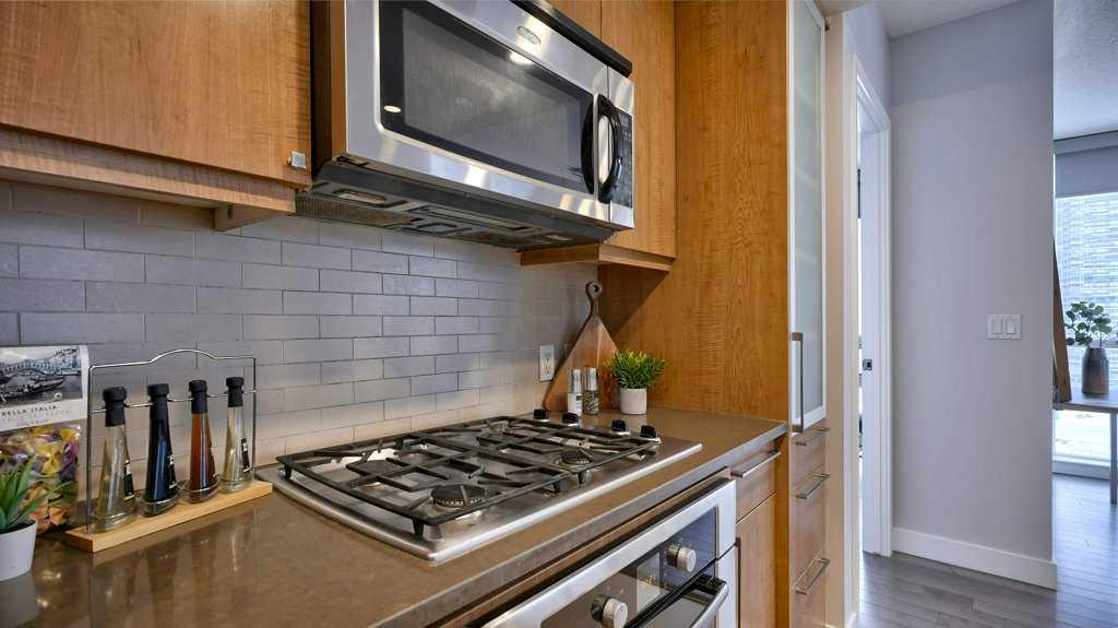 Panoramic city skyline views surround this sleek 14th-floor corner residence, featuring expansive floor-to-ceiling windows with custom blinds and a contemporary 2-bed, 2-bath layout. Freshly painted from top to bottom, including all trim and baseboards, for a crisp, move-in-ready finish. Step into a generous entryway with rich hardwood floors that extend into the bright, open-concept living space. The modern kitchen features extensive cabinetry with convenient pull-out shelves, sleek stainless steel appliances, and elegant quartz countertops. The kitchen flows seamlessly into the sun-filled living room and open dining area, which extends onto a glass-railed balcony offering uninterrupted city views. Thoughtfully designed with bedrooms on opposite sides, this layout ensures maximum privacy. The primary suite offers a spacious walkthrough closet and a luxurious 5-piece ensuite complete with double sinks, a deep soaker tub, and an oversized shower. The second bedroom provides two closets and a stylish 3-piece ensuite featuring a fully tiled shower and contemporary vanity. The flex room offers versatility as a den, home office (with cable and electrical outlets), or generous in-suite storage. Convenient in-suite laundry includes a Bosch washer and dryer. Residents of Nova enjoy a wealth of amenities: a state-of-the-art fitness Centre, inviting social room, guest suites, secure bike storage, 24-hour concierge/security, and a beautifully maintained outdoor garden on the second floor. The pet-friendly location is exceptional—Co-op and Tim Hortons are right across the street, the C-Train is just three blocks away, and 17th Avenue’s vibrant dining, shopping, parks, and off-leash dog parks are all within easy walking distance.