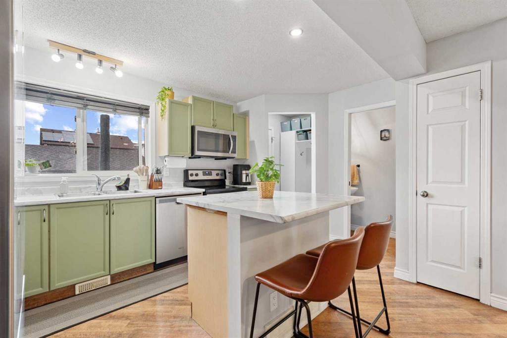 Situated in the charming and highly sought-after south community of McKenzie Towne, this upgraded 4-bedroom, 3.5-bath semi-detached home perfectly blends comfort, style, and convenience. Enjoy easy access to all amenities along 130th Avenue, including restaurants, grocery stores, Walmart, Home Depot, and more, with quick routes to Deerfoot Trail and Stoney Trail for effortless commuting. The inviting open-concept main floor connects the living room, dining area, and kitchen, which features ample cabinet space, a functional island with an eating bar, and access to a large east-facing deck, recently updated in 2025, overlooking a fully fenced and landscaped backyard. Upstairs, the spacious primary bedroom easily accommodates a king-size bed and includes a 3-piece ensuite. Two additional bedrooms share a full 4-piece bath, while laminate flooring flows throughout the main and upper levels. The fully developed basement offers a large recreation room, a fourth bedroom, a 3-piece bath, and convenient laundry facilities. Recent upgrades include vinyl plank flooring (Basement - 2023), new washer and dryer (2023), new over-the-range microwave (2023), and a new refrigerator (2024). The exterior was freshly painted in 2025. A double oversized detached garage, fully insulated, drywalled, and equipped with a garage door opener, completes this fantastic home. With thoughtful upgrades throughout and a prime location in McKenzie Towne, this property is truly a must-see! Don’t wait—schedule a showing today and fall in love with your new home in the charming McKenzie Towne!