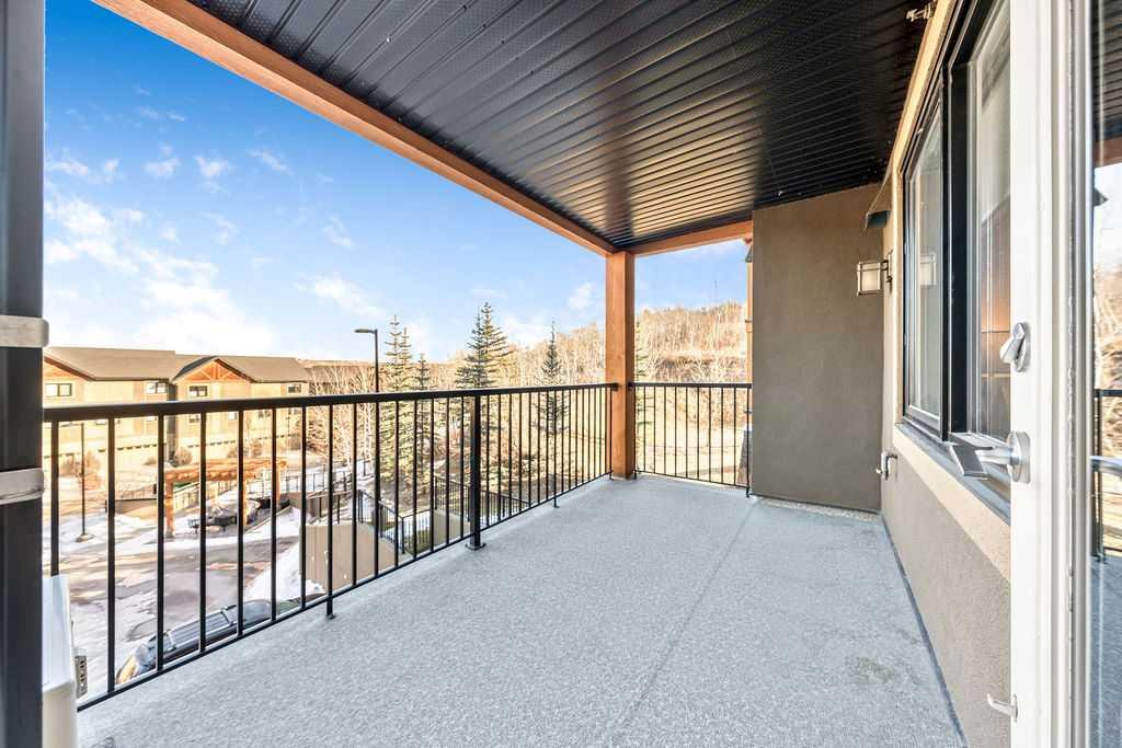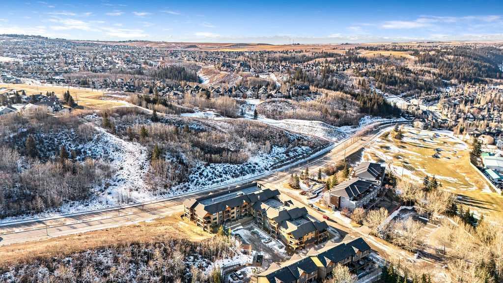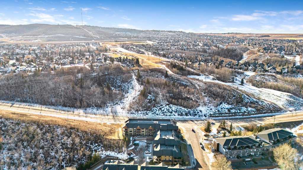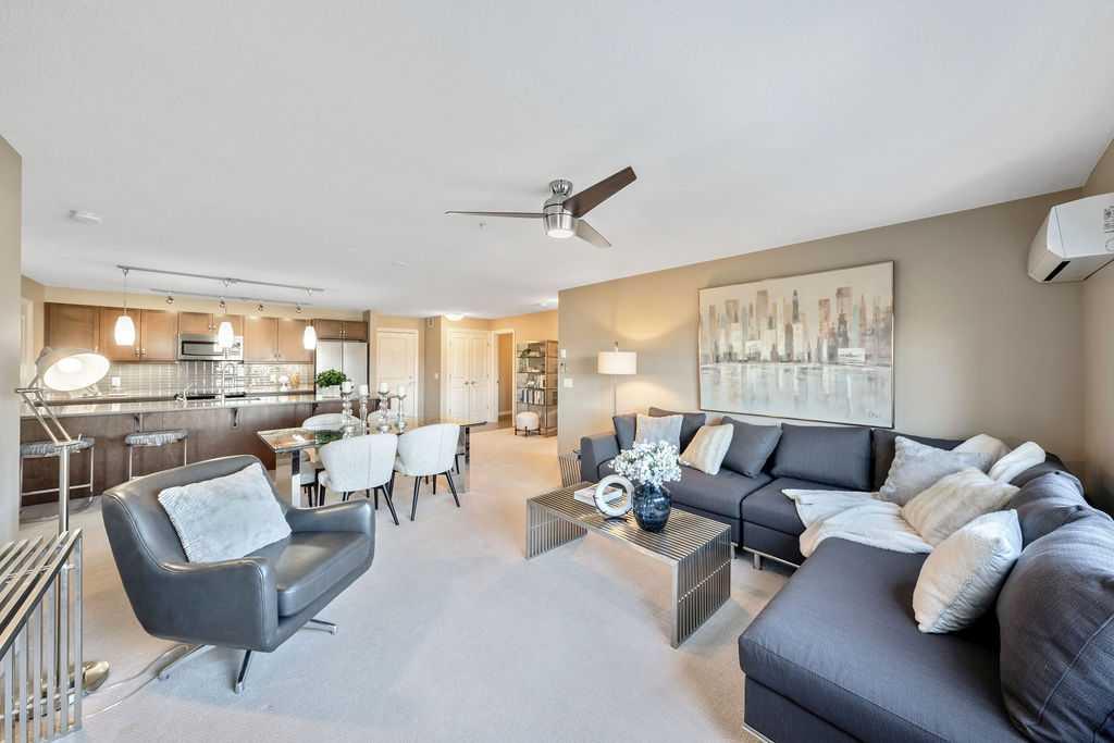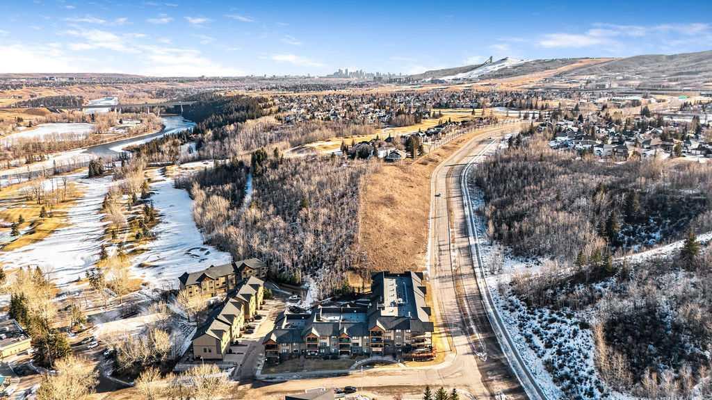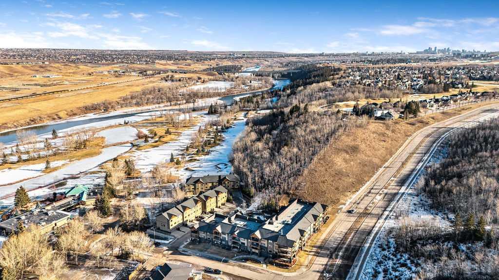 OPEN HOUSE SATURDAY JANUARY 24TH 1-3 PM. This beautifully maintained third-floor residence offers a rare blend of serenity, space, and thoughtful design within an intimate, adult-oriented (18+) building known for its strong governance and exceptional reserve fund. Inside, natural light pours through expansive windows, illuminating a well-considered floor plan that balances openness with privacy. The kitchen is both elegant and functional, anchored by stone countertops, stainless steel appliances (including a brand-new refrigerator), an oversized breakfast bar, under-cabinet lighting, a reverse-osmosis water system, and a generously sized pantry. It flows seamlessly into a dining area designed to comfortably host gatherings both casual and refined. The living room is spacious and inviting, and gives direct access to the balcony, an outdoor extension large enough for a BBQ and lounge seating, where peaceful nature views and visiting wildlife become part of daily life. The primary suite offers a calm and restorative escape, complete with a walk-through double-sided closet and a private ensuite with additional linen storage. A well-proportioned second bedroom and a substantial four-piece main bath, also featuring extra storage, provide flexibility for guests, hobbies, or a home office. Completing the interior is a massive in-unit laundry room, a rare and highly practical feature. Comfort is elevated year-round with air conditioning, while convenience is enhanced by two titled parking stalls (one underground, one surface) and a titled storage locker located on the same floor as the unit. Beyond the home, residents enjoy a beautifully appointed lobby and vibrant community amenities including a gazebo with outdoor gathering area - often the backdrop for weekly happy hours and social gatherings. Moments from the river pathways, Valley Ridge Golf Course, COP, and with effortless access to Stoney Trail and the mountains, this is a lifestyle defined by ease, connection, and quiet sophistication. Private, peaceful, and impeccably cared for, this is Valley Ridge living at its finest.