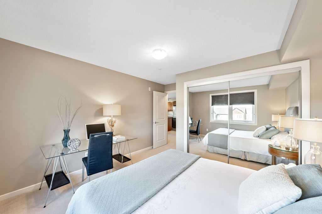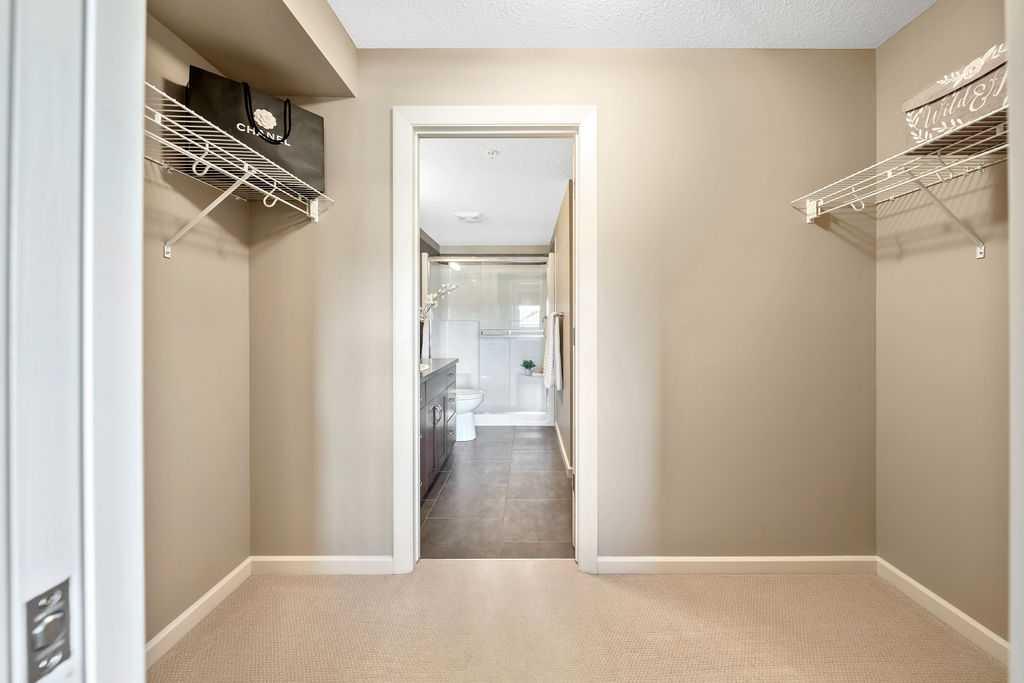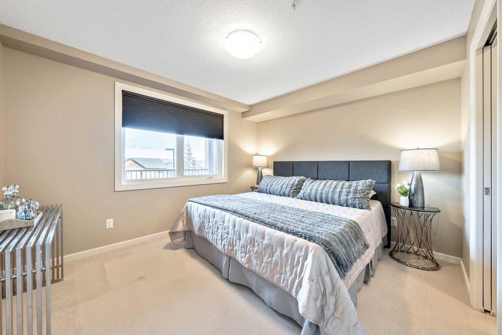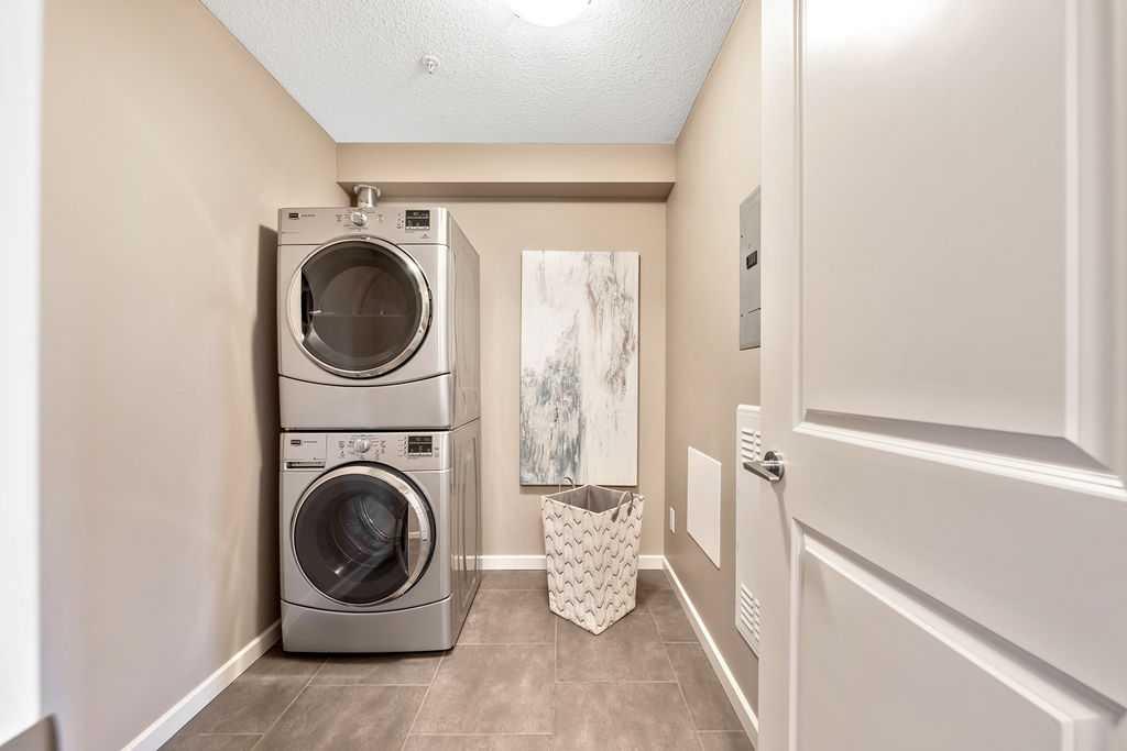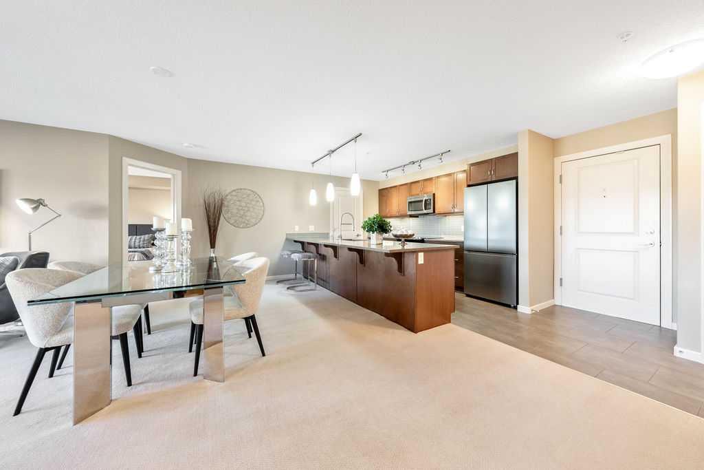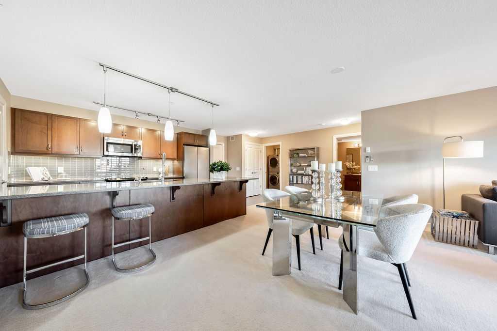 OPEN HOUSE SATURDAY JANUARY 24TH 1-3 PM. This beautifully maintained third-floor residence offers a rare blend of serenity, space, and thoughtful design within an intimate, adult-oriented (18+) building known for its strong governance and exceptional reserve fund. Inside, natural light pours through expansive windows, illuminating a well-considered floor plan that balances openness with privacy. The kitchen is both elegant and functional, anchored by stone countertops, stainless steel appliances (including a brand-new refrigerator), an oversized breakfast bar, under-cabinet lighting, a reverse-osmosis water system, and a generously sized pantry. It flows seamlessly into a dining area designed to comfortably host gatherings both casual and refined. The living room is spacious and inviting, and gives direct access to the balcony, an outdoor extension large enough for a BBQ and lounge seating, where peaceful nature views and visiting wildlife become part of daily life. The primary suite offers a calm and restorative escape, complete with a walk-through double-sided closet and a private ensuite with additional linen storage. A well-proportioned second bedroom and a substantial four-piece main bath, also featuring extra storage, provide flexibility for guests, hobbies, or a home office. Completing the interior is a massive in-unit laundry room, a rare and highly practical feature. Comfort is elevated year-round with air conditioning, while convenience is enhanced by two titled parking stalls (one underground, one surface) and a titled storage locker located on the same floor as the unit. Beyond the home, residents enjoy a beautifully appointed lobby and vibrant community amenities including a gazebo with outdoor gathering area - often the backdrop for weekly happy hours and social gatherings. Moments from the river pathways, Valley Ridge Golf Course, COP, and with effortless access to Stoney Trail and the mountains, this is a lifestyle defined by ease, connection, and quiet sophistication. Private, peaceful, and impeccably cared for, this is Valley Ridge living at its finest.