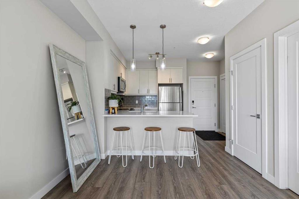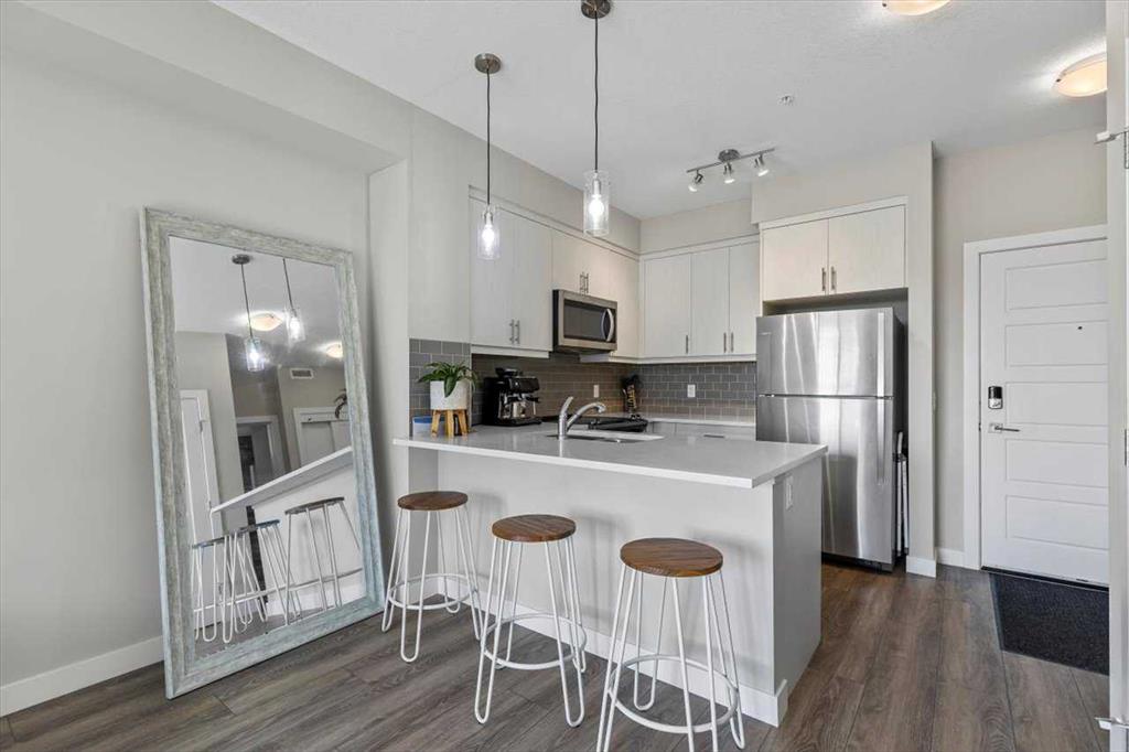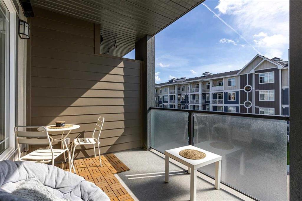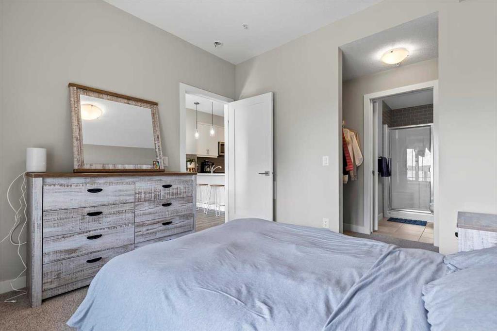 Lake Living in Auburn Bay! Step into this beautifully maintained one-bedroom condo on the 3rd floor — the perfect choice for first-time buyers or savvy investors. Bathed in natural light from its east-facing windows, the open-concept living and kitchen area creates a bright and inviting atmosphere. The kitchen is a true highlight, featuring ceiling-height soft-close white cabinetry, a sleek quartz island, stainless steel appliances, and a full tile backsplash. The spacious bedroom offers a walk-through closet leading directly to a stylish 4-piece ensuite with a walk-in shower and modern vanity. You’ll also enjoy the convenience of in-suite laundry with a stacked washer and dryer. Step outside to your large private patio with a BBQ gas hookup — perfect for morning coffee or summer evenings. Additional features include 9-foot ceilings and a separate storage locker for all your extras. Located in an unbeatable spot, you’re just steps from Co-Op grocery, the South Health Campus, Auburn Bay Lake, schools, parks, and the dog park. Don’t miss this opportunity to enjoy lake community living with every amenity at your doorstep!