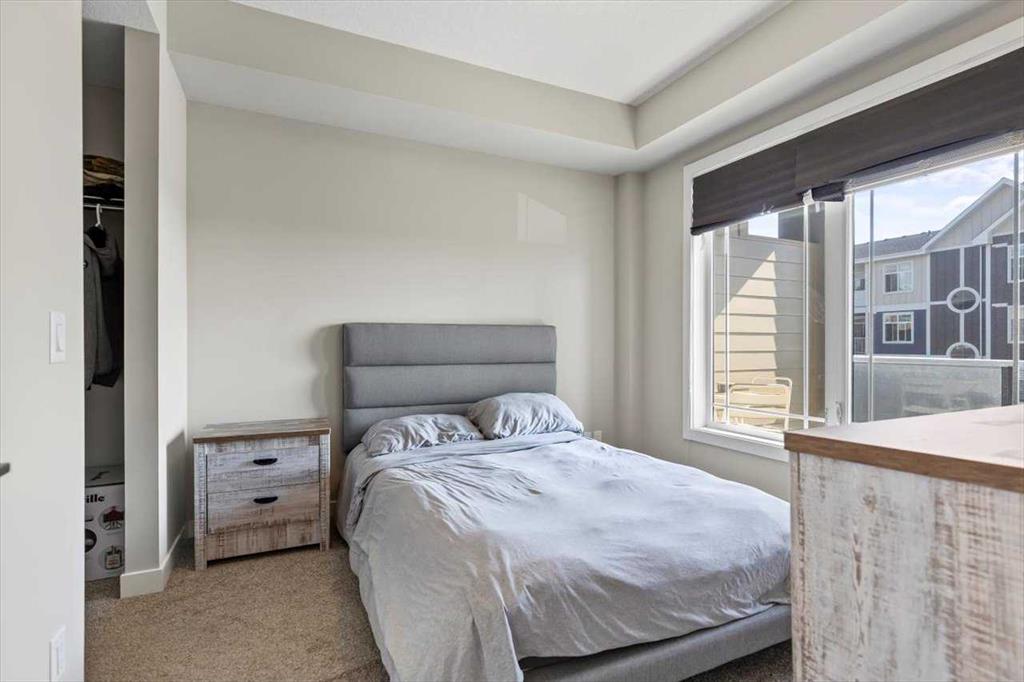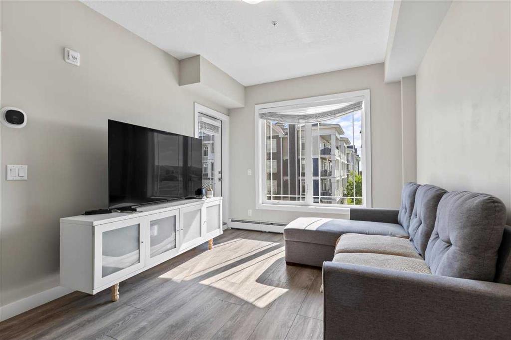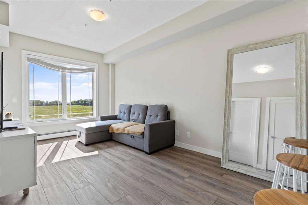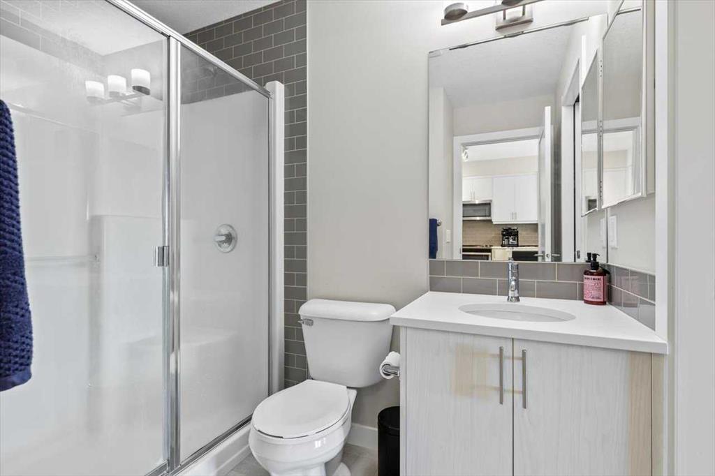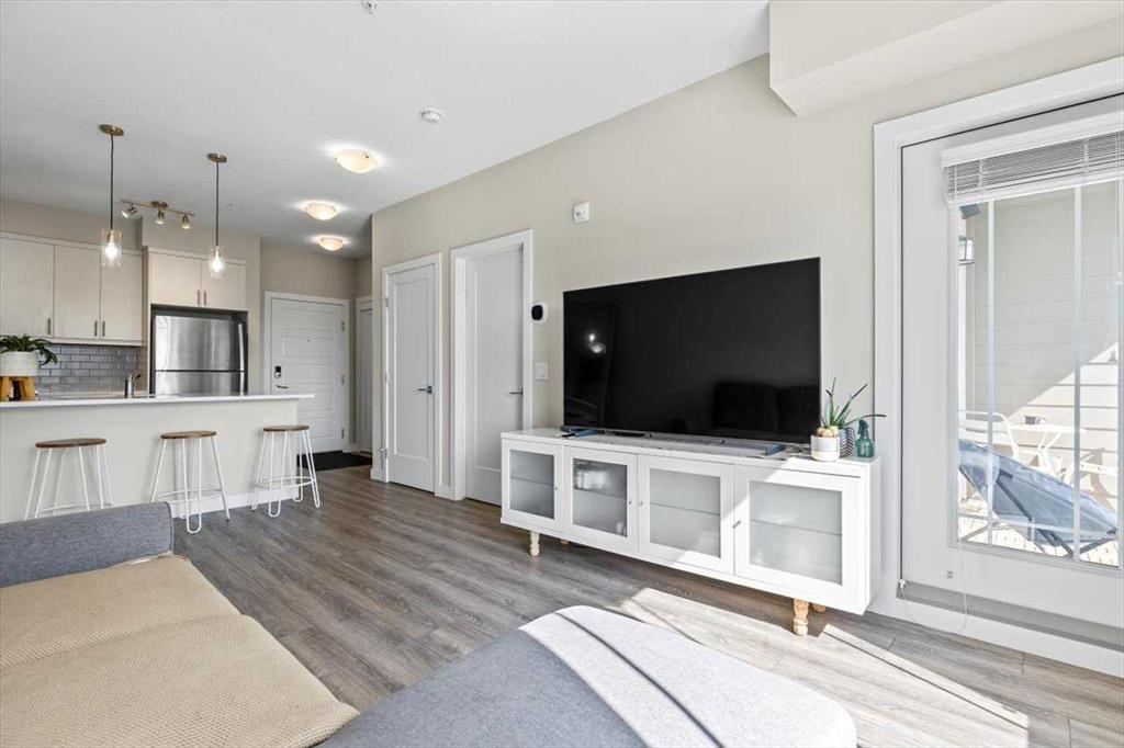 Lake Living in Auburn Bay! Step into this beautifully maintained one-bedroom condo on the 3rd floor — the perfect choice for first-time buyers or savvy investors. Bathed in natural light from its east-facing windows, the open-concept living and kitchen area creates a bright and inviting atmosphere. The kitchen is a true highlight, featuring ceiling-height soft-close white cabinetry, a sleek quartz island, stainless steel appliances, and a full tile backsplash. The spacious bedroom offers a walk-through closet leading directly to a stylish 4-piece ensuite with a walk-in shower and modern vanity. You’ll also enjoy the convenience of in-suite laundry with a stacked washer and dryer. Step outside to your large private patio with a BBQ gas hookup — perfect for morning coffee or summer evenings. Additional features include 9-foot ceilings and a separate storage locker for all your extras. Located in an unbeatable spot, you’re just steps from Co-Op grocery, the South Health Campus, Auburn Bay Lake, schools, parks, and the dog park. Don’t miss this opportunity to enjoy lake community living with every amenity at your doorstep!