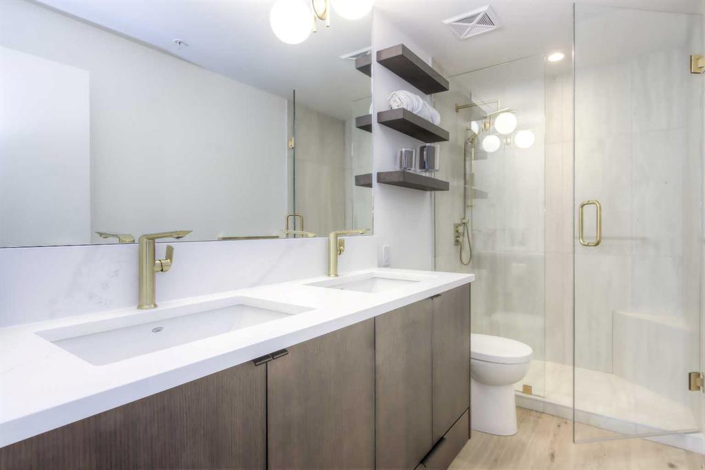 From the moment you walk in, this luxury penthouse in Bridgeland Crossings II will take your breath away, showcasing unobstructed east-facing views of Tom Campbell Hill. One of the largest homes in the complex, this top-floor concrete residence features two bedrooms, three bathrooms, and a den has undergone an extensive, high-end renovation with premium finishes and attention to every detail. The thoughtfully designed open-concept floor plan is ideal for modern living and entertaining, enhanced by soaring 10 feet ceilings, expansive windows, luxury laminate flooring, air conditioning, and solar-powered electronic blinds throughout. Natural light fills the living and dining areas, seamlessly connecting to the oversized balcony—an outdoor retreat complete with a gas line for barbecuing and the perfect spot to enjoy morning coffee or evening sunsets. At the heart of the home is a chef-inspired kitchen featuring custom cabinetry, quartz countertops, and a book matched waterfall Calacatta Suprema brushed quartz island. The premium appliance package includes top-of-the-line Bosch Benchmark Series appliances with an integrated panel-front refrigerator and dishwasher, a built-in microwave drawer, gas cooktop, and an LG 5.2 cu. ft. Black Stainless Steel WashTower. This intelligently designed layout offers two private bedroom suites positioned on opposite sides of the condo, each functional as a primary bedroom with its own ensuite. The main primary suite features a spacious walk-in closet with custom organizers and a luxurious four-piece ensuite appointed with premium satin brass Baril faucets and a Baril shower kit with a 10mm shower glass door. The second bedroom also enjoys its own ensuite bathroom, providing exceptional privacy and comfort. A third full bathroom is conveniently located for guests. Additionally, the den with glass doors provides a flexible space for a home office, study, or possible wine room. Both walk-in closets have been fully upgraded with custom storage solutions for optimal organization. This exceptional penthouse also includes two titled, side-by-side parking stalls (situated best in the complex) and a storage locker. Residents of Bridgeland Crossings II enjoy outstanding amenities, including two fully equipped fitness centers, a yoga studio, sports lounge/movie room, community gardens, an outdoor patio lounge with barbecues, dog wash station, guest suite, and bike storage. Located in one of Calgary’s most vibrant and sought-after communities, this home is steps from parks, pathways, trendy shops, cafés, and restaurants. Enjoy easy access to the Bow River Pathway System, Bridgeland C-Train Station, Murdoch Park, Calgary Zoo, Telus Spark, and the natural beauty of Tom Campbell Hill. This is more than a home—it’s a lifestyle. Don’t miss the opportunity to own this beautifully renovated, high-end penthouse and experience the very best of Bridgeland living.