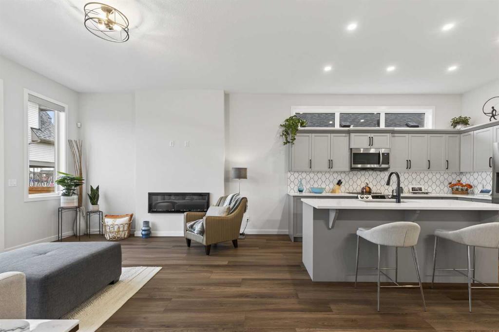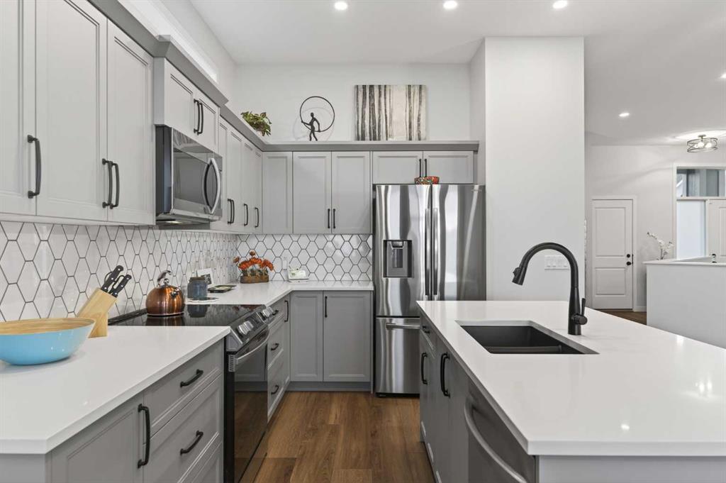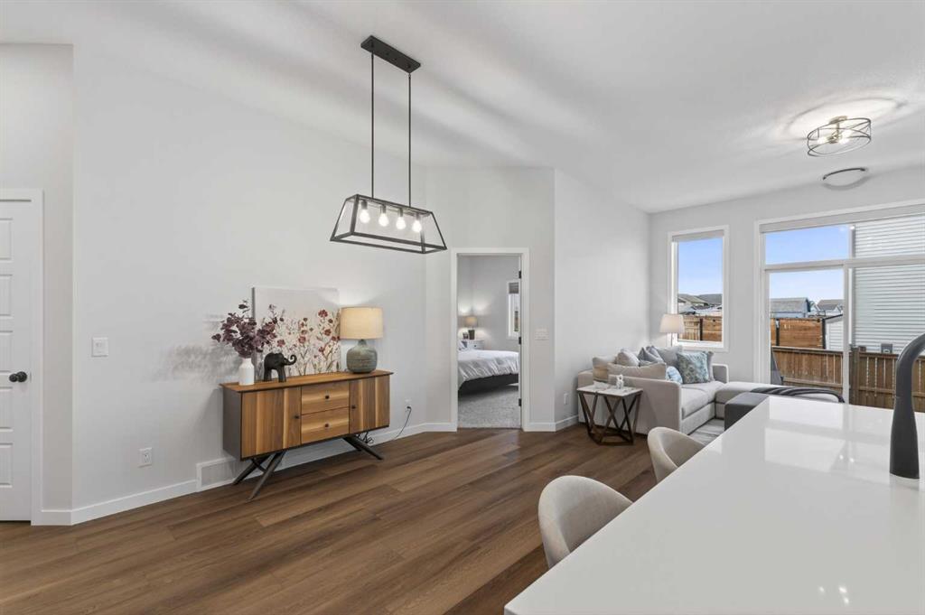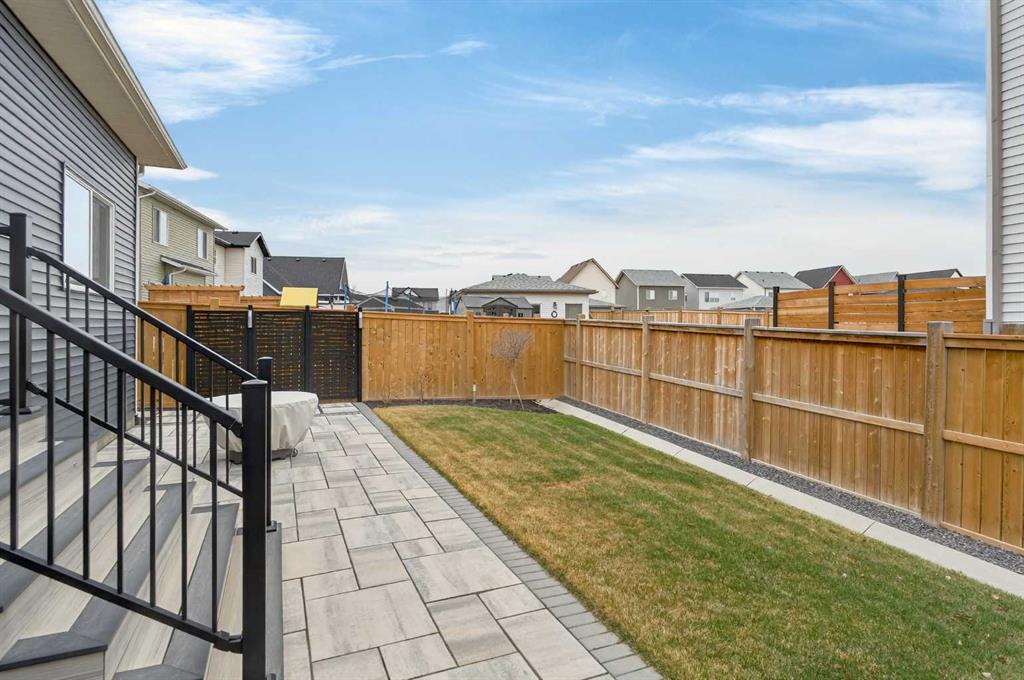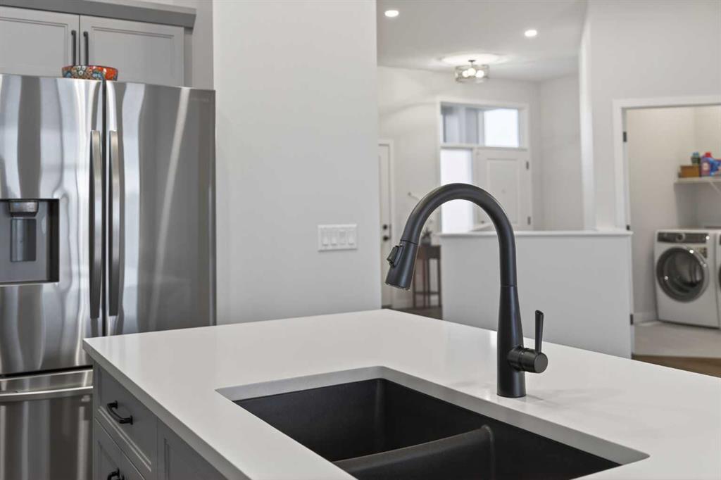 Welcome to 125 Amery Crescent - an immaculate modern bungalow in the sought-after Vista Crossing neighbourhood of Crossfield with quick access to Airdrie and Calgary. This beautifully designed home offers a comfortable and thoughtful design, perfect for both everyday living and entertaining. Showing like-new throughout, this stunning move-in ready home is beautiful both inside and out with professional landscaping completing the west-facing backyard. Stepping inside, you’ll be greeted by an open-concept layout that seamlessly connects the main living areas with soaring ceilings and a bright living space all year round. Large windows flood the space with natural light, highlighting the bright and airy feel throughout. The timeless kitchen is complete with grey shaker cabinetry and white quartz countertops with a large central island that provides additional seating space. The kitchen opens to the main living room and dining areas - creating the perfect space for everyday living and entertaining. A central fireplace with TV hook-ups anchors the main living area with a wall of windows and patio doors opening to the west-facing backyard. The spacious primary suite is a true retreat, complete with a luxurious four-piece ensuite including dual sinks with endless storage space and a walk-in shower with tile complete to the 10' ceilings. Completing the primary suite is a generous walk-in closet. A second well-sized bedroom spanning ~10'x12' and a full bathroom with soaker tub, as well as a laundry room complete the main level. Thoughtful details and warm neutral tones give the home a welcoming sense of elegance and provide the perfect single-level living space. The expansive basement is complete with bathroom rough-in and provides ample space for a future recreation room, bedroom, bathroom and storage area. Completing the home is a double attached garage that is fully drywalled with a finished floor - ensuring a clean and seamless living space throughout the entire home. Outdoors, enjoy a sunny west-facing yard perfect for summer barbecues or quiet evenings under the sky. The professionally landscaped exterior features a stone patio that spans the width of the property and overlooks the backyard with lighting features, 4-zone irrigation and a beautiful front entryway with flowering shrubs - offering a fully complete exterior. If the summer heat becomes too hot, the central A/C will keep you comfortable all summer long. This move-in ready home is immaculate both inside and out - presenting the perfect bungalow for those looking to downsize without compromise in quiet and charming Crossfield. *Virtual tour available upon request.