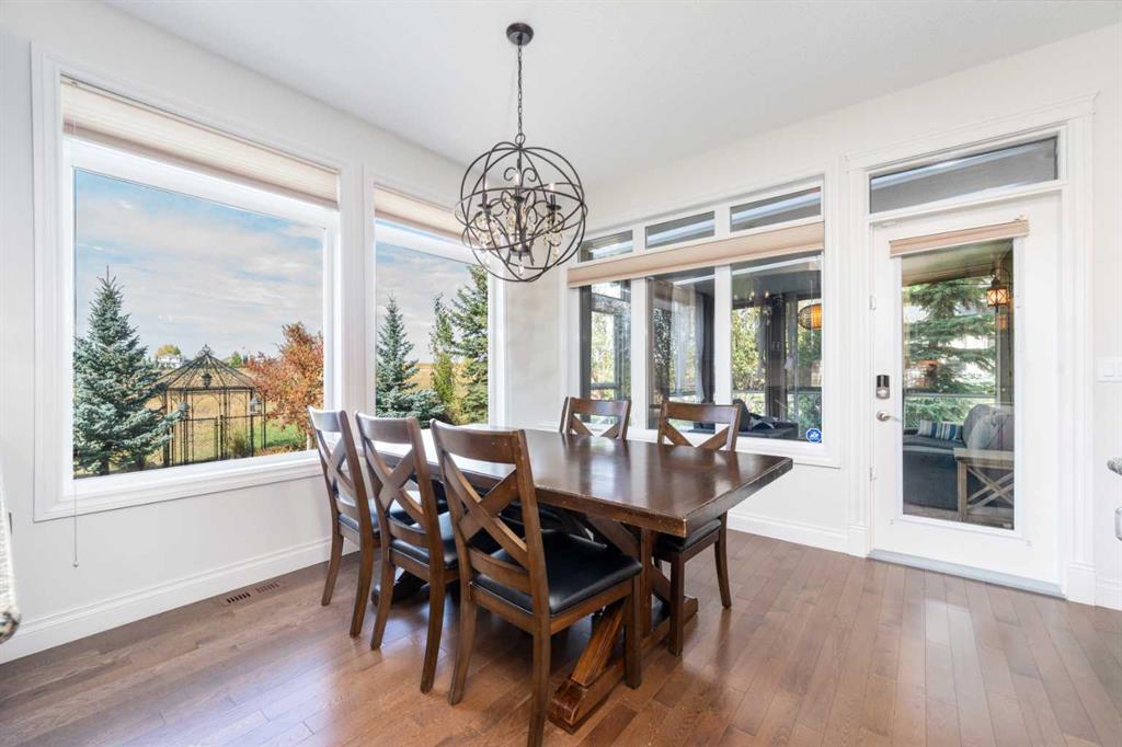 Looking for a home that has the “wow” factor the moment you step inside? This former show home in Okotoks’ highly desirable Air Ranch community delivers exactly that—and so much more. With 5 bedrooms, 3.5 bathrooms, and nearly every upgrade you could ask for, this property backs directly onto greenspace, offering a unique setting you won’t find anywhere else. It’s a rare combination of refined design and everyday comfort, all wrapped up in one incredible package. From the moment you walk in, the grand foyer makes an impression with 18’ ceilings, a sweeping spiral staircase, and natural light that fills the main floor. The layout is built for both entertaining and family living. The kitchen is every chef’s dream—featuring a Wolf gas range, Viking fridge, custom Hammersmith hood fan, and a convenient water filtration/softener system. Rich cabinetry runs floor-to-ceiling, paired with granite counters, a large island, and a walk-in pantry to keep everything organized. Throughout the main level, you’ll notice thoughtful details that set this home apart. A built-in audio system lets you enjoy music in every room. The office, tucked behind distinctive arched French doors, provides a quiet space for work or study. Even the laundry room has been elevated with granite counters to match the home’s cohesive, upscale feel. Upstairs, three generously sized bedrooms and two full bathrooms provide plenty of space for family and guests. The primary suite is the highlight—a true retreat with room for a king-sized bed and private seating area. The 5-piece ensuite feels like a spa with a granite double vanity, corner soaker tub, walk-in tiled shower, and expansive walk-in closet. The fully finished lower level is where this home really shines. With two additional bedrooms, a 3-piece bath featuring a steam shower, and a large family room complete with a cozy gas fireplace and built-in entertainment centre, there’s space for everyone. A granite-topped wet bar with sink, wine fridge, and microwave makes it easy to entertain or kick back for movie nights. You’ll also find a large finished storage area to keep everything neatly tucked away. Car enthusiasts or families with multiple vehicles will appreciate the massive heated garage, designed with both function and space in mind. Outdoors, the lifestyle continues with a screened-in covered sunroom off the kitchen eating nook, leading to a stone patio with a built-in fireplace and additional gas lines ready for your BBQ & sunroom. Surrounded by mature trees, Gemstone lights for year-round curb appeal, and serviced by an underground sprinkler system, the yard is both private and low-maintenance. Central AC adds comfort through the summer months, so you’ll enjoy this home year-round. Air Ranch is one of Okotoks’ most distinctive communities, known for its quiet streets, beautiful homes, and unique aviation history. If you’re after a property that checks every box—style, function, and location—this home has it all. Come take a look for yourself!