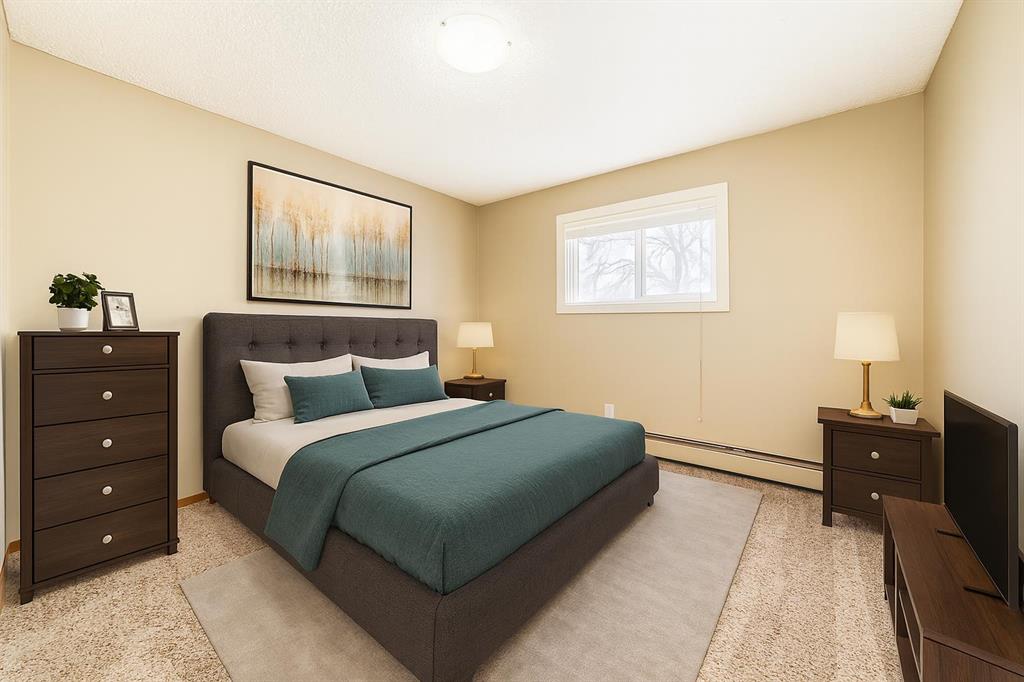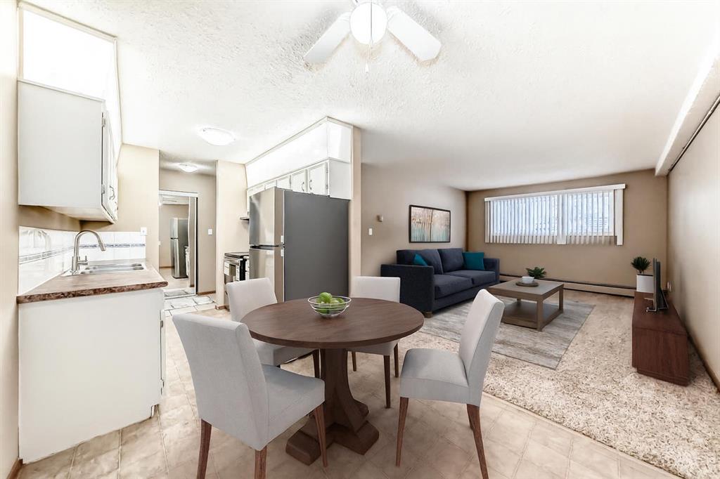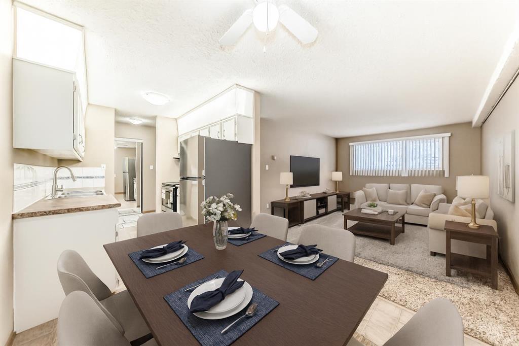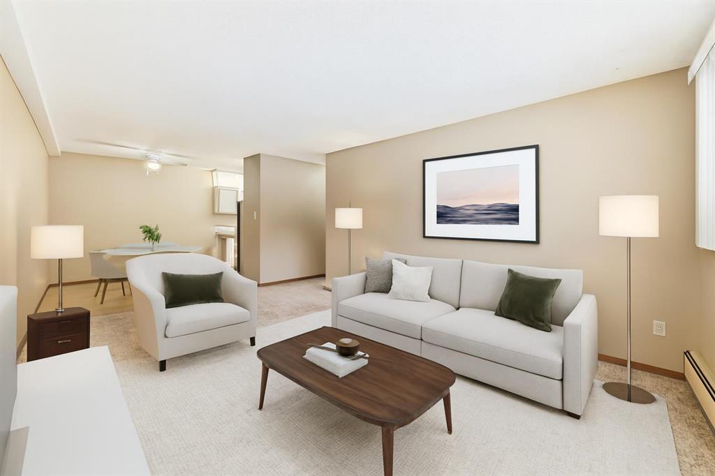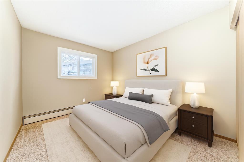 Great shape 2 bedroom unit. Numerous improvements over the years and shows very well. 2 bedrooms with double mirrored closet door in spacious primary bedroom ,upgraded dome light fixtures with LED bulbs, freshly steam cleaned carpet in Living room and bedrooms, lino in KI/DI, ceramic tiles in Entrance area with mirrored closet doors. The full 4 Pce Bathroom has ceramic floor tiles, Bath tub has ceramic tiles and shower doors, ceramic sink, large mirror and built in medicine cabinet. Kitchen has lots of cabinetry, re painted, double sink, ceramic backsplash, retro California sunshine ceiling. New stainless steel FRIDGE ,STOVE , HOOD FAN in this efficient galley kitchen opens to dining area. All good size vinyl windows and good window coverings. Coin laundry in the building. Paved assigned parking stall with power and room for more vehicles on the street. Condo fees cover for insurance, heating, water, sewer, garbage, all exterior repairs as well as snow removal, and lawn care. Tenant pays for power. Building has had extensive exterior and interior improvements and it shows. New Intercom system plus Security camera's in building. Common Laundry room on same level. Now that makes for a winning opportunity on this property. Seller will include 2 months of prepaid condo fees. See some ideas of furnishing of your new home.