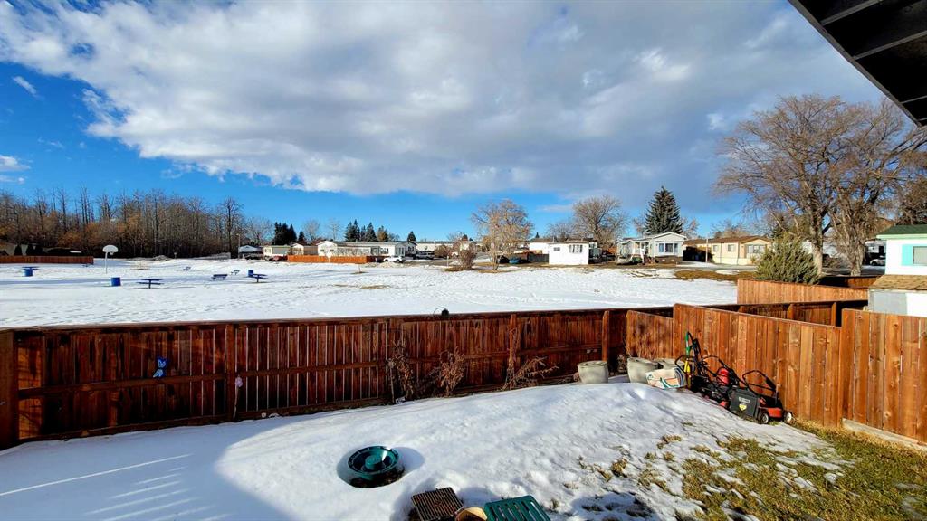 Located in one of Mustang Acres’ most desirable locations, backing directly onto a park and playground, this 1,218 sq. ft., 3 bedroom, 2 bathroom mobile home offers a functional layout, has seen several updates over the years, and provides excellent potential for the next owner. Notable additions include a spacious primary bedroom with a full 4-piece ensuite and a bonus family/living room at the rear of the home. The layout features two entrances (side and back), a main bathroom with a large shower enclosure, and practical living space throughout. The home has been peaked and sided to meet current park requirements, with a durable tin roof, and updated windows. Outdoor features include a screened-in deck with skylight, fully enclosed underneath, a paved driveway, a fully fenced yard, and convenient rear storage, offering additional space for seasonal items and outdoor equipment. Cat owners will appreciate the secure pet door to the deck, ideal for a litter box area with no escape risk. Lot fees include water, sewer, and garbage, making this a convenient and affordable option in a prime location.