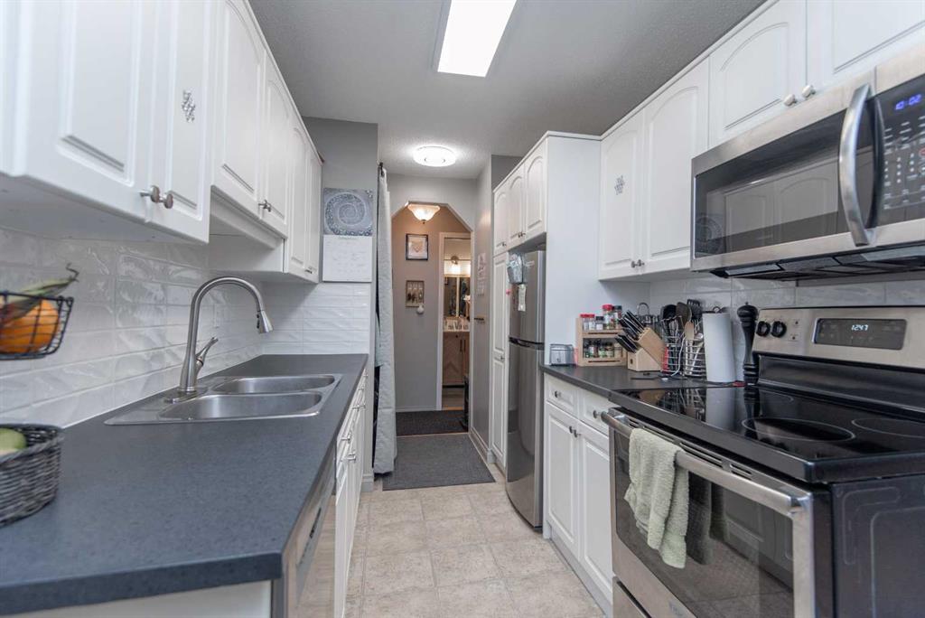 Beautiful one-bedroom condo located in the heart of vibrant downtown Red Deer, offering an attractive, low-maintenance lifestyle ideal for busy professionals or active urban dwellers. Situated on the second floor, this east-facing unit is filled with natural light and features a well-designed, functional floor plan. Enjoy the morning sun from the spacious balcony, perfect for coffee or quiet relaxation. The living room is thoughtfully designed for comfort and convenience, featuring a corner gas fireplace, a Murphy bed for occasional overnight guests, and an in-wall air-conditioning unit to keep you cool during hot summer days. The kitchen has been tastefully upgraded with new backsplash tile and countertops, is equipped with newer appliances, and opens to the dining area, ideal for everyday living or entertaining. All light fixtures have been updated with modern finishes throughout the unit. The generously sized bedroom easily accommodates a king-size bed. A four-piece bathroom and a separate storage room complete the unit. Free shared laundry facilities are conveniently located directly across the hall. Additional features include secure building entry, elevator access, and heated underground parking with one assigned stall. The condo association is financially sound, with condo fees of $487.85/month, which include heat, water, sewer, garbage collection, insurance, professional management, and snow removal. Pets are allowed with restrictions. This condo offers an exceptional opportunity to enjoy an active, walkable lifestyle, just steps from shopping, restaurants, coffee shops, the Red Deer Public Library, and the beautiful Waskasoo, Coronation, and Barrett Parks, along with extensive walking trails and indoor/outdoor recreation. Carefree living —ideal for those seeking comfort, convenience, and a vibrant lifestyle.
