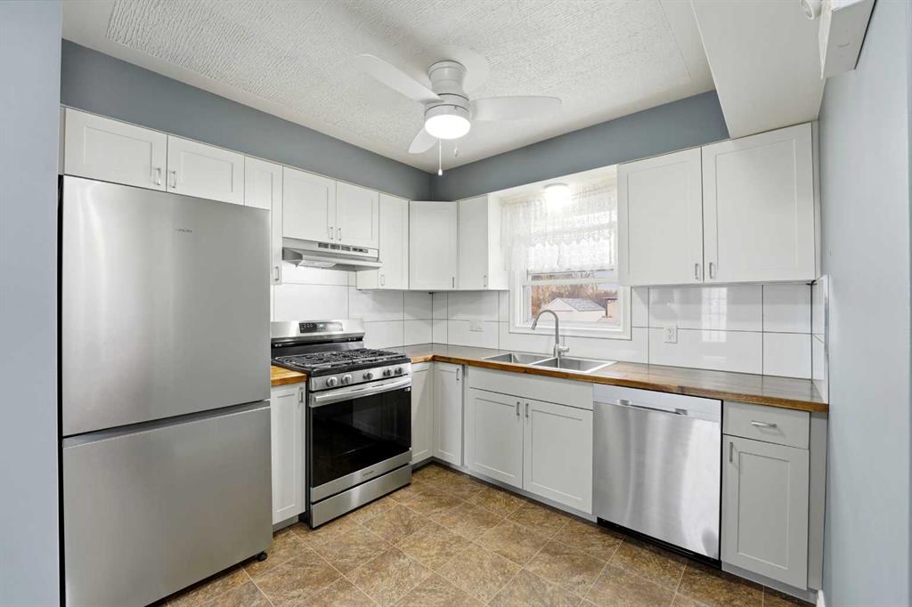 Take a look at this spacious character home built in 1953 on a huge double lot, fully fenced for your family with mature landscaping, new rear decking and plenty of parking. The front entrance features a south-facing deck and opens to beautiful original hardwood flooring throughout the main floor. You'll be impressed with the tasteful modern updates which were professionally done in 2025. The floor plan of the main living area was tastefully opened up adding a central breakfast bar with microwave oven, gorgeous textured ceiling, brand new kitchen cabinets with gas stove, stainless steel fridge and dishwasher, new sink, countertops, lighting and upgraded wiring. The main bathroom was also refreshed with new tub/ tiled shower surround, vanity, toilet and lighting. There are three spacious bedrooms on the main floor all freshly painted with newer vinyl windows. From the rear entrance and the kitchen, steps lead to a bright family room below with a cozy gas fireplace, tiled flooring, spacious fourth bedroom (no closet), second full bathroom with 36" shower and an extra flex room also with a window. The laundry set is recessed with closet doors in front. Recent further upgrades also include an added electric panel, new waste line to the city service. "Make your home here" in this classic family neighbourhood.