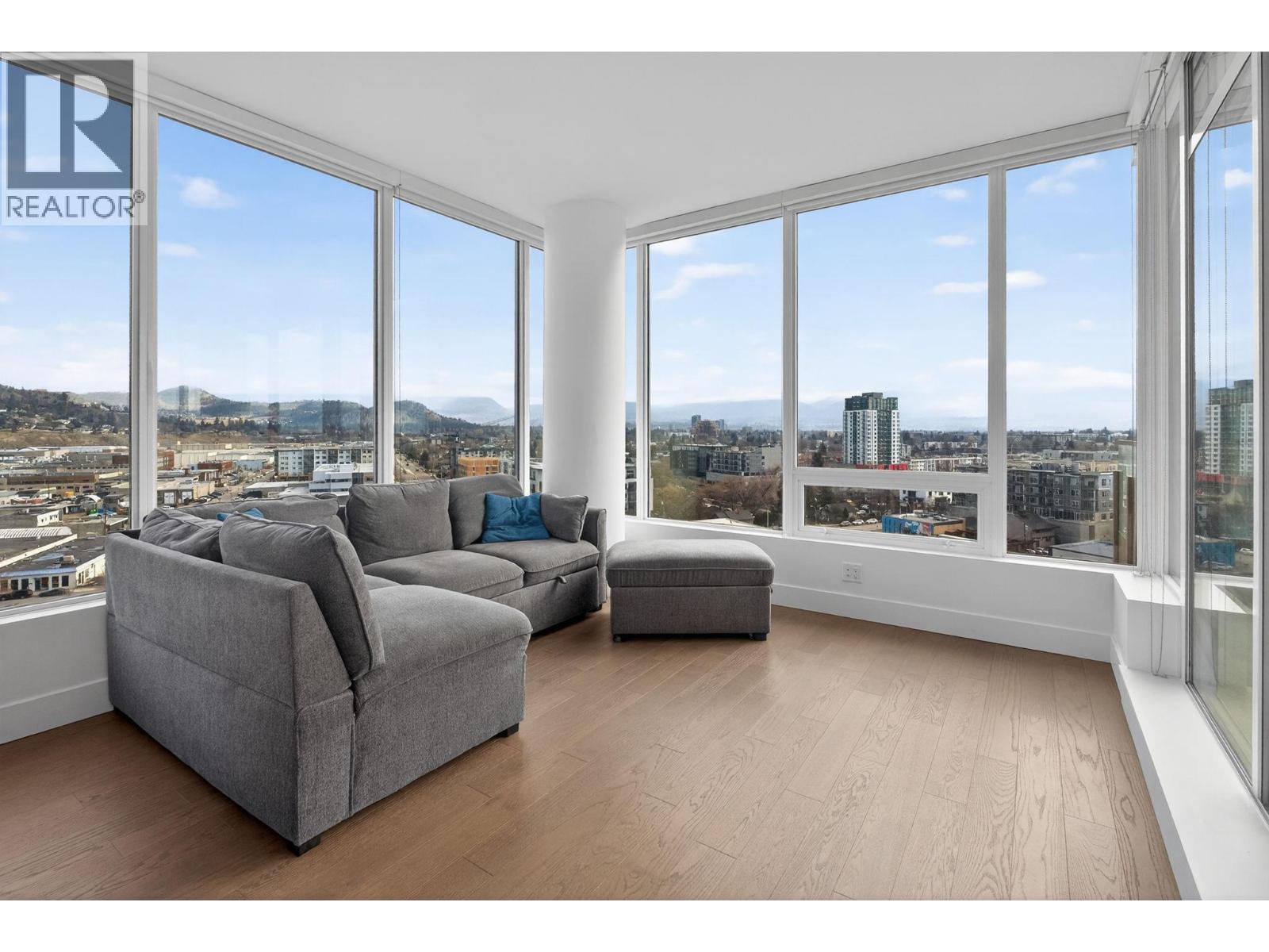 Downtown Kelowna. With a view to the east mountains and south/west overlooking Prospera Arena, the City lights, lake and bridge. The deck offers you a front row seat to view all the activities below you. Floor to ceiling windows flood the space with natural lights. Open concept is anchored by a modern kitchen, featuring quartz countertops, full height custom cabinetry and stainless appliances. 2 bedroom, 2 bathroom corner unit. Primary bedroom has 3 piece tiled walk-in shower and a spacious walk-in closet. Room off entry adds practical storage or office. Ownership gives you access to 2 pools, hot tubs, fitness center, yoga, steam room, pickleball courts, car wash, & Pilates studio, outdoor BBQ, fire pits, guest suites. Front door concierge service. Separate storage locker on floor 2. Parking is on 1st floor, accommodates a large truck. Downtown living doesn't get any better than this. Leave your car and walk to the restaurants, cultural districts, boardwalk, and the beaches on Lake Okanagan Lake.
