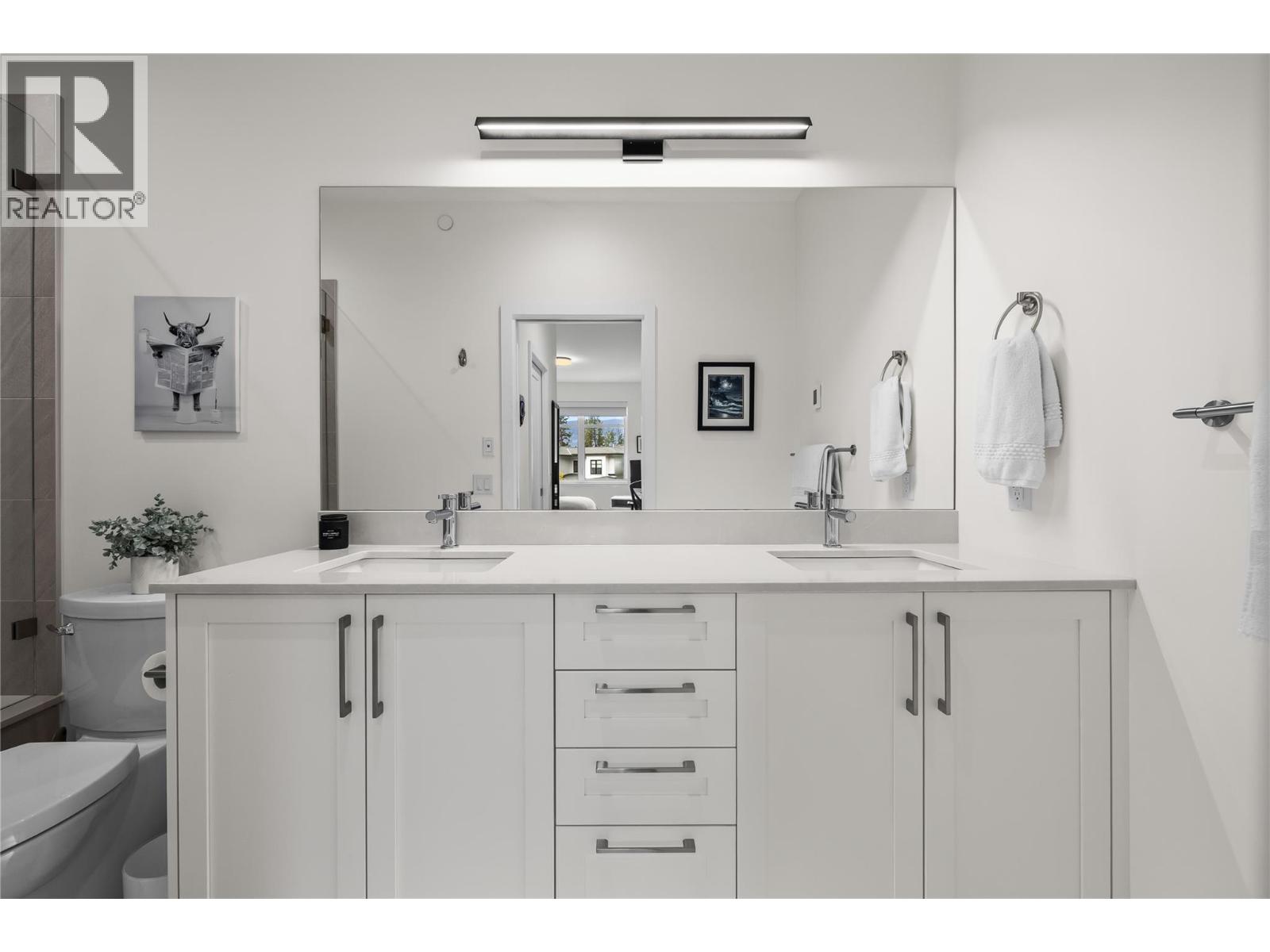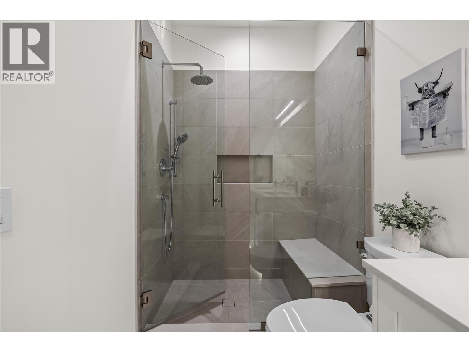 Discover refined living at Quail Landing, an exclusive enclave along the 18th hole of the Championship Quail Course. This beautifully crafted home blends sophisticated design with everyday comfort. Bright interiors by Hatch Interior Design showcase wide-plank German-made laminate flooring, 9’ ceilings, expansive sliding doors for seamless indoor-outdoor living, and privacy film on all windows. A sleek linear stone fireplace anchors the living space, while smart thermostats and energy-efficient systems ensure year-round comfort. The chef-inspired kitchen features premium KitchenAid appliances, including a 5-burner gas range, quiet dishwasher, and French-door fridge, complemented by quartz countertops, soft-close shaker cabinetry, and a custom island perfect for entertaining. Upstairs, the spa-like ensuite offers heated tile floors, quartz counters, chrome fixtures, and a custom glass shower with bench seating. A spacious 586 sq. ft. crawl space provides excellent storage. Enjoy resident-only amenities including a private firepit, EV charging upgrades, natural gas BBQ hookups, and private road access. Minutes to the airport, UBCO, and walking trails, this well-maintained community also offers green space and a peaceful setting.